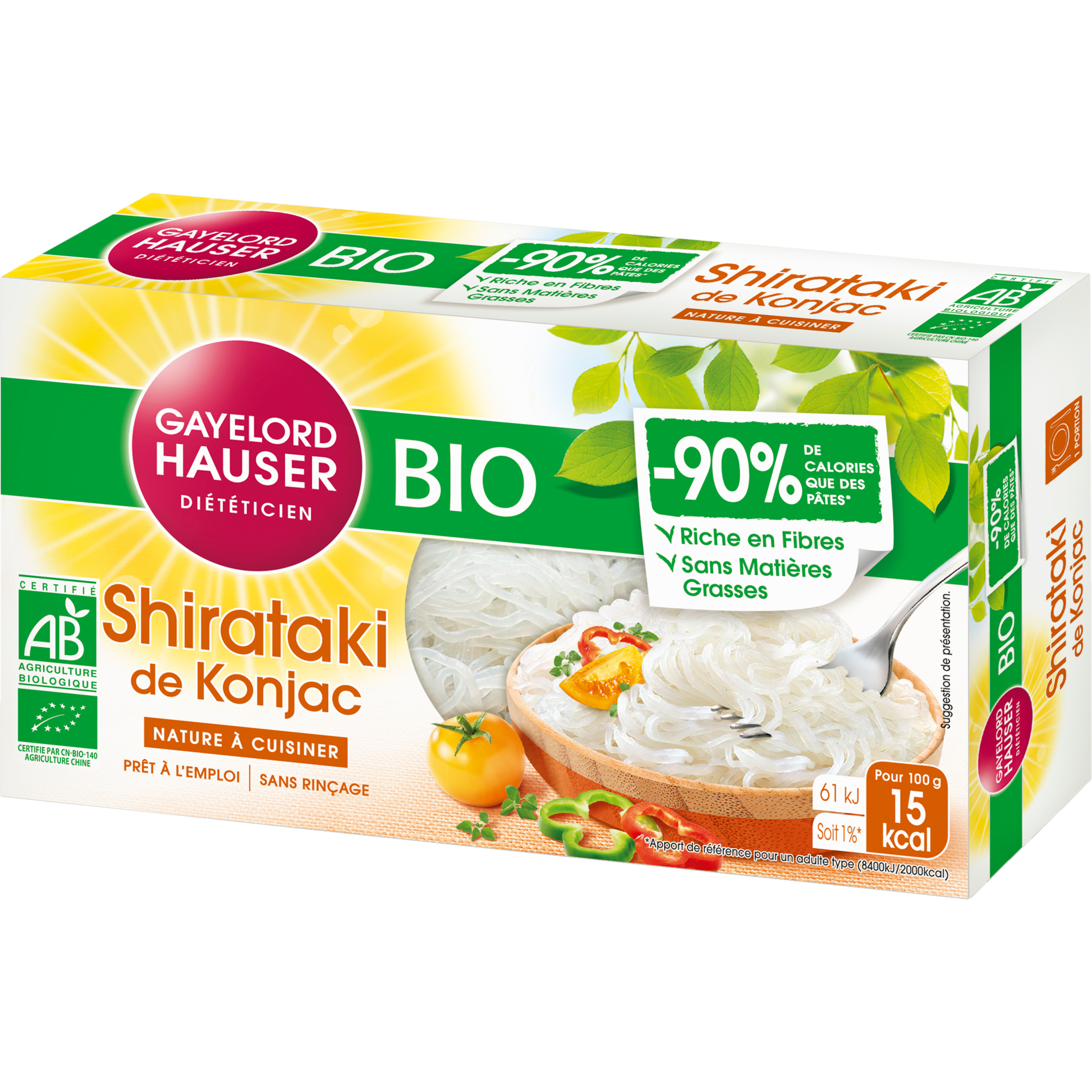 Les shiratakis de Konjac BIO sont une excellente alternative aux pâtes classiques avec seulement 15 calories par portion soit 85% de moins que les pâtes. Elles se consomment à toutes les sauces et remplacent les pâtes aux côtés de vos viandes ou légumes. Riches en fibres, sans matières grasses et à teneur réduite en glucides par rapport aux pâtes, elles permettent de se faire plaisir sans culpabiliser ! Le Konjac est un ingrédient traditionnel et naturel originaire d'Asie dont les fibres gonflent au contact de l'eau dans l'estomac, donnant ainsi un effet rassasiant. Son packaging en carton est recyclable.