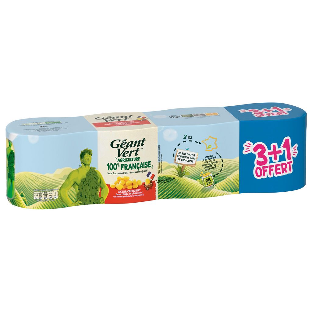 Ce maïs doux extra croquant est sans OGM (Organisme Génétiquement Modifié), sans sucres ajoutés et sans résidu de pesticides*. Le maïs Géant Vert est cultivé dans le Sud-Ouest de la France et mis en conserve dans notre usine à Labatut. De plus, il est récolté à parfaite maturité et mis en boîte dans les 12h après la récolte. Ce maïs français s'adapte à toutes vos envies en salade ou plat chaud ! *dans la limite de quantification (voir sur www.geantvert.fr)