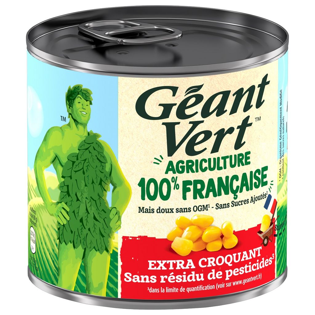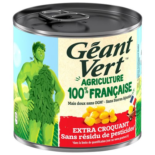 Ce maïs doux extra croquant est sans OGM (Organisme Génétiquement Modifié), sans sucres ajoutés et sans résidu de pesticides*. Le maïs Géant Vert est cultivé dans le Sud-Ouest de la France et mis en conserve dans notre usine à Labatut. De plus, il est récolté à parfaite maturité et mis en boîte dans les 12h après la récolte. Ce maïs français s'adapte à toutes vos envies en salade ou plat chaud ! *dans la limite de quantification (voir sur www.geantvert.fr)