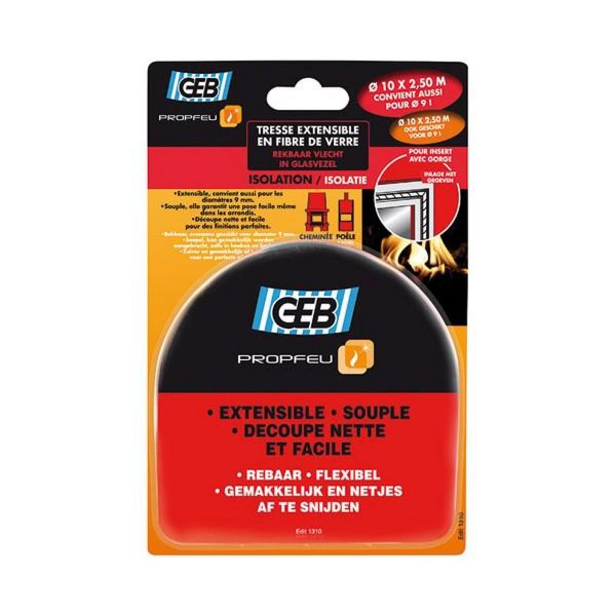 Geb 821523 - Tresse ronde d'étanchéité Propfeu GEB, pour portes de fours, poêles, inserts, chaudières.Gaine en fibre de verre tricotée et lubrifiée au graphite.Diamètre : 10 mmLongueur : 2.5 mTrès souple, elle se compresse et se découpe.Pour l'entretien de vos cheminées.Excellentes qualités mécaniq
