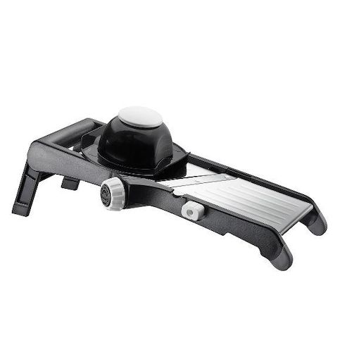 Gefu 89429 Mandoline - Laola - Indispensable pour la découpe de vos fruits et légumes ! - Lame horizontale intégrée en inox de haute qualité - Molette latérale pour le réglage de l'épaisseur - Tranches lisses ou ondulées de 1 à 9 mm - Bâtonnets de julienne 4.5 ou 9 mm - Bouton poussoir pour une util