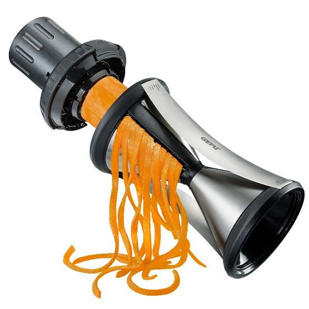 Gefu 13700 Taille-légumes - Spirelli XL - Un mariage réussi entre fonctionnalité. design élégant et matériel de haute qualité - Le taille-légumes SPIRELLI XL transforme même les légumes les plus épais. tels que radis. betteraves rouges. pommes de terre ou courgettes. en spirales infinies et extra-larges - Adapté aux légumes de max. Ø 6.5 cm - 2 tailles différentes de julienne : 4.5 mm. 8 mm - Poussoir à encliquetage avec 3 broches inox pour garantir une bonne tenue dès le départ - Brosse de nettoyage incluse - Lames en acier japonais.