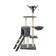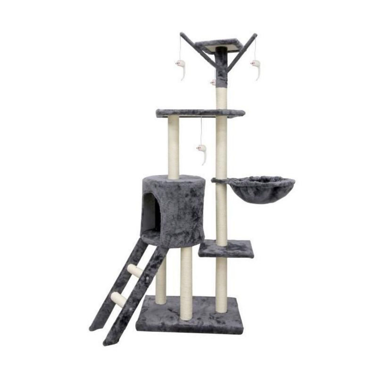 Moyen arbre a chat JIPSY avec niche et souris - ALC11 - Couleur : gris - Dimensions : 79 x 34 x 138 cm - Structure : 3 plateformes, 4 souris, 1 niche, 1 perchoir, 1 escalier et poteaux a griffer - Composition : Tige en sisal de dia. 7 cm, tissu court en peluche 220 gsm, plateaux inférieurs 49 x 34 cm, hamac 30 x 30 cm, plateforme supérieure : 20 x 20 cm, 2eme plateforme : 25 x 38 cm, 3eme plateforme : 25 x 25 cm