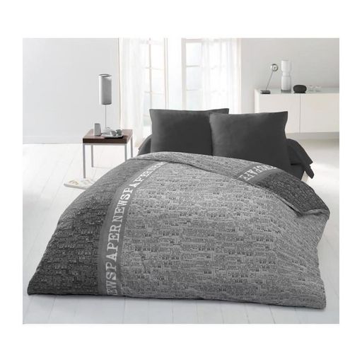 Parure de couette Microfibre NEWSPAPER comprenant 1 housse de couette 220x240cm et 2 taies d'oreillers 63x63cm - Composition : Microfibre 100% Polyester 82g - Coloris : Gris Clair & Anthracite - Motif fantaisie - Housse de couette et taies zippées - Pour lit 2 personnes - Laver séparément a 30°C.