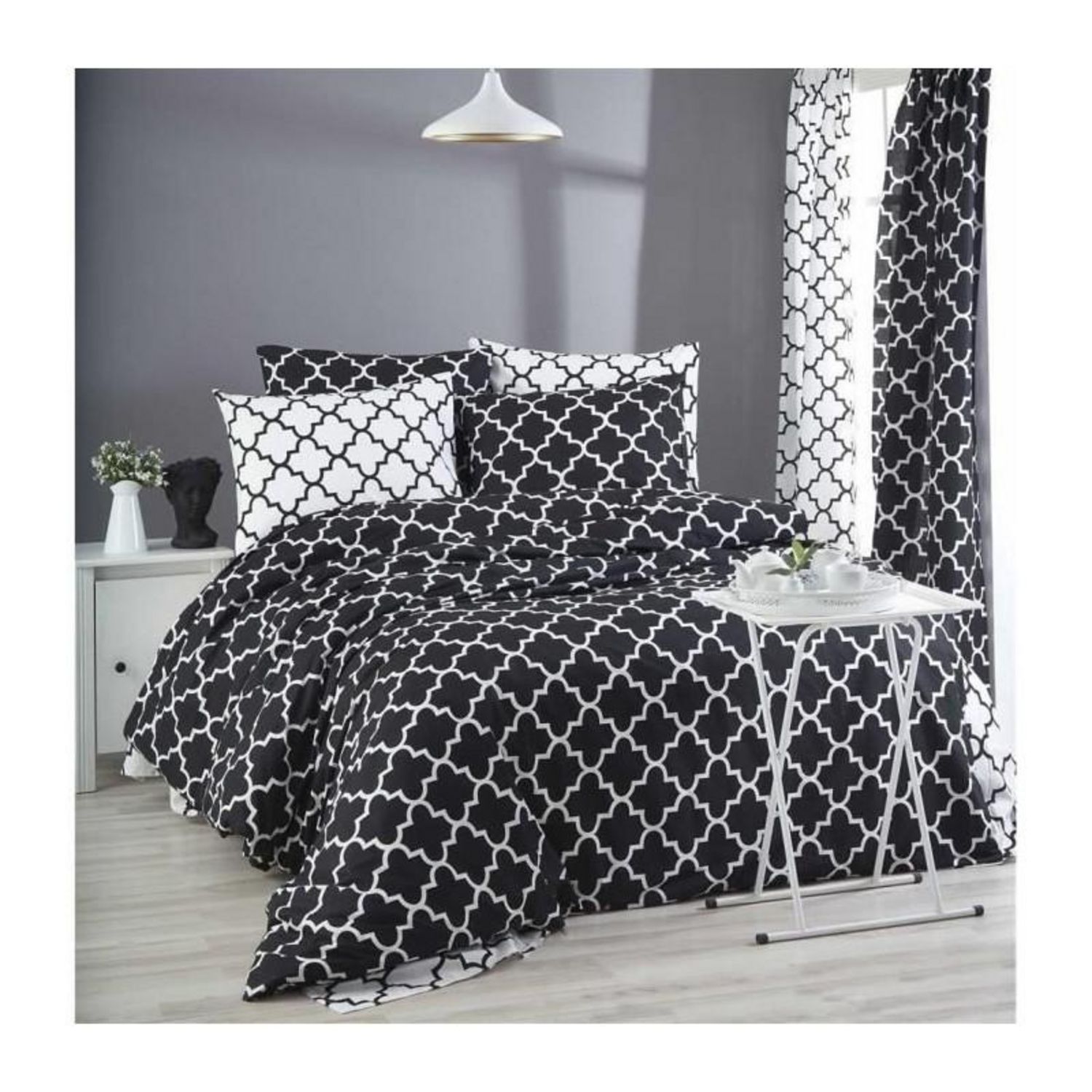 Découvrez le confort et le style ultimes avec notre ensemble de housses de couette renforcé King. Transformez votre chambre a coucher en un sanctuaire luxueux grâce a notre ensemble de housses de couette renforcé King. Fabriqué en 100% coton renforcé, cet ensemble de literie exquis offre un confort et un style inégalés. Profitez de la douceur du coton 100% renforcé. Fabriqué en coton renforcé de premiere qualité, notre ensemble de housses de couette est incroyablement doux et agréable au contact de votre peau. Faites l'expérience du confort ultime en vous enfonçant dans la douceur de ce tissu luxueux. Améliorez le décor de votre chambre a coucher avec une élégance intemporelle. Avec sa combinaison de couleurs noire et blanche, notre ensemble de housses de couette ajoute une touche de sophistication et d'élégance a n'importe quelle chambre a coucher. Le design altique et les couleurs neutres en font un choix polyvalent qui s'adapte a tous les styles d'intérieur, du moderne au traditionnel. Facile a entretenir, facile a aimer. Nous comprenons l'importance de la commodité dans votre vie active. C'est pourquoi notre ensemble de housses de couette est lavable en machine a 30 °C, ce qui permet de le garder propre et frais sans effort. Passez moins de temps a vous préoccuper de l'entretien et plus de temps a profiter du confort qu'il vous procure. Détails techniques. Taille de la housse de couette : 240 x 220 cm. Taie d'oreiller : 60 x 60 cm (2 pieces). Fabriquée en 100% coton renforcé pour un confort supérieur. 140 fils au pouce carré pour une sensation de douceur. Systeme de fermeture de la taie d'oreiller : Enveloppe. Systeme de fermeture de la housse de couette : Boutons. Améliorez votre chambre a coucher avec notre ensemble de housses de couette renforcé King et découvrez le mélange parfait de confort et de style.