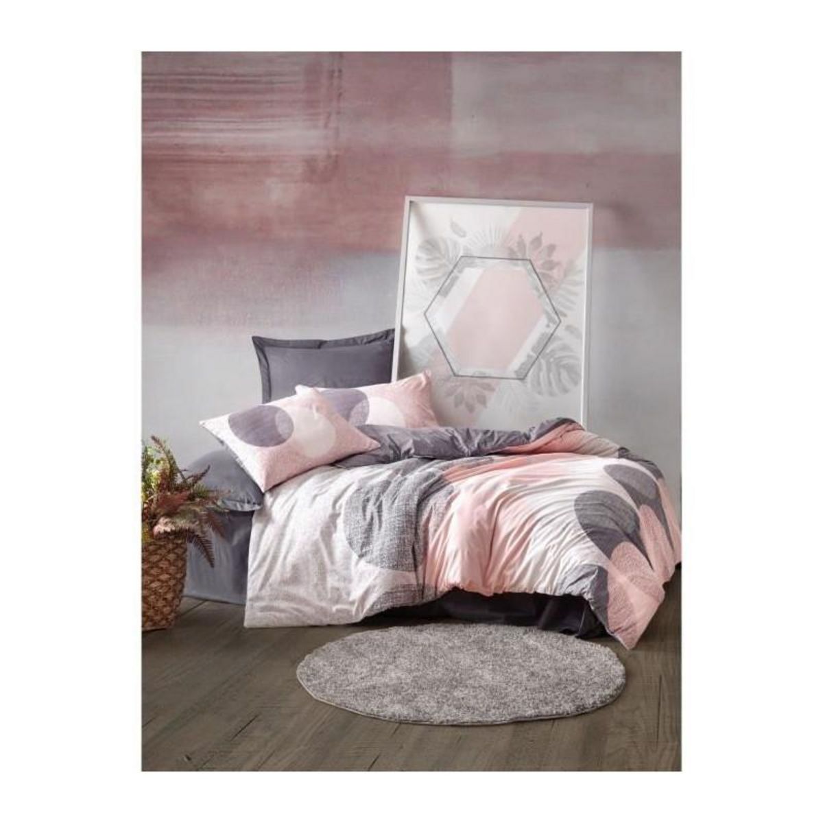 Transformez votre chambre a coucher en une oasis de sérénité avec notre ensemble de housses de couette Ranforce King. Faites l'expérience du luxe et du confort ultimes avec notre ensemble de housses de couette Ranforce King. Fabriqué en 100% coton ranforce, cet ensemble de literie exquis élevera instantanément l'ambiance de votre chambre a coucher. Une douceur et une durabilité inégalées. Fabriqué avec une attention méticuleuse aux détails, notre ensemble de housses de couette offre un toucher somptueusement doux et lisse contre votre peau. Le tissu en coton de haute qualité garantit une durabilité exceptionnelle, vous permettant de profiter de sa beauté pendant des années. Créer un look élégant et stylé. Avec son étonnante combinaison de couleurs grises, roses et blanches, notre ensemble de housses de couette ajoute une touche de sophistication a la décoration de toute chambre a coucher. La technique d'impression pigmentaire rehausse l'éclat et la profondeur des couleurs, créant un design visuellement saisissant et captivant. Facile a entretenir. Nous comprenons l'importance de la commodité dans votre vie active. C'est pourquoi notre ensemble de housses de couette est lavable en machine a 40 °C, ce qui permet de le garder propre et frais sans effort. Le systeme de fermeture a enveloppe pour les taies d'oreiller et les boutons pour la housse de couette garantissent un ajustement sûr et un retrait facile pour un entretien sans souci. Détails techniques: Matiere : 100% coton ranforce. Taille de la housse de couette : 240 x 220 cm. Taie d'oreiller : 60 x 60 cm (2 pieces). Impression pigmentaire pour une meilleure vivacité des couleurs. Lavable en machine a 40 °C. Nombre de fils : 145. Systeme de fermeture de la taie d'oreiller : Enveloppe. Systeme de fermeture de la housse de couette : Boutons.