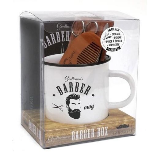 Dans un superbe mug, découvrez le kit indispensable pour prendre soin de sa barbe et de ses moustaches : - un petit peigne en bois pour démêler et redonner du volume, - une paire de ciseaux pour assurer une bonne précision de coupe, - une pince à épiler pour traquer les poils difficiles d'accès, - une petite serviette de toilette. Un livre illustré avec les précieux conseils de la Barbière de Paris pour entretenir moustaches et barbe au quotidien : le bon matériel, les gestes de taille et les soins.
