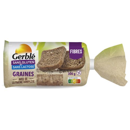 Pain de mie avec de la farine complète de sarrasin et aux graines de tournesol et de lin, sans gluten et sans lactose, particulièrement adapté aux personnes intolérantes au gluten et/ou au lactose