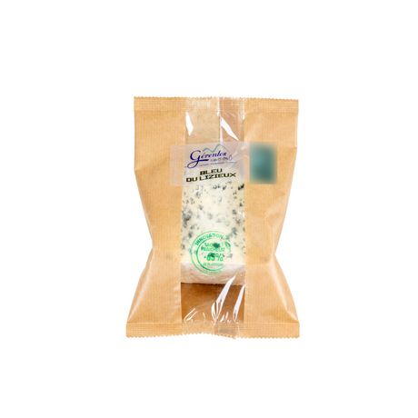 Fromage au lait de vache à pâte persillée de couleur bleu pale, croute fleurie blanche, texture souple et onctueuse, saveur douce