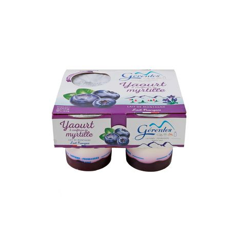 yaourt 84% ( LAIT entier de montagne 95%, poudre de LAIT écrémé 5%, ferments LACTIQUES ), confiture de myrtille 16% (myrtille 50%, sucre 50%, gélifiant : pectine)