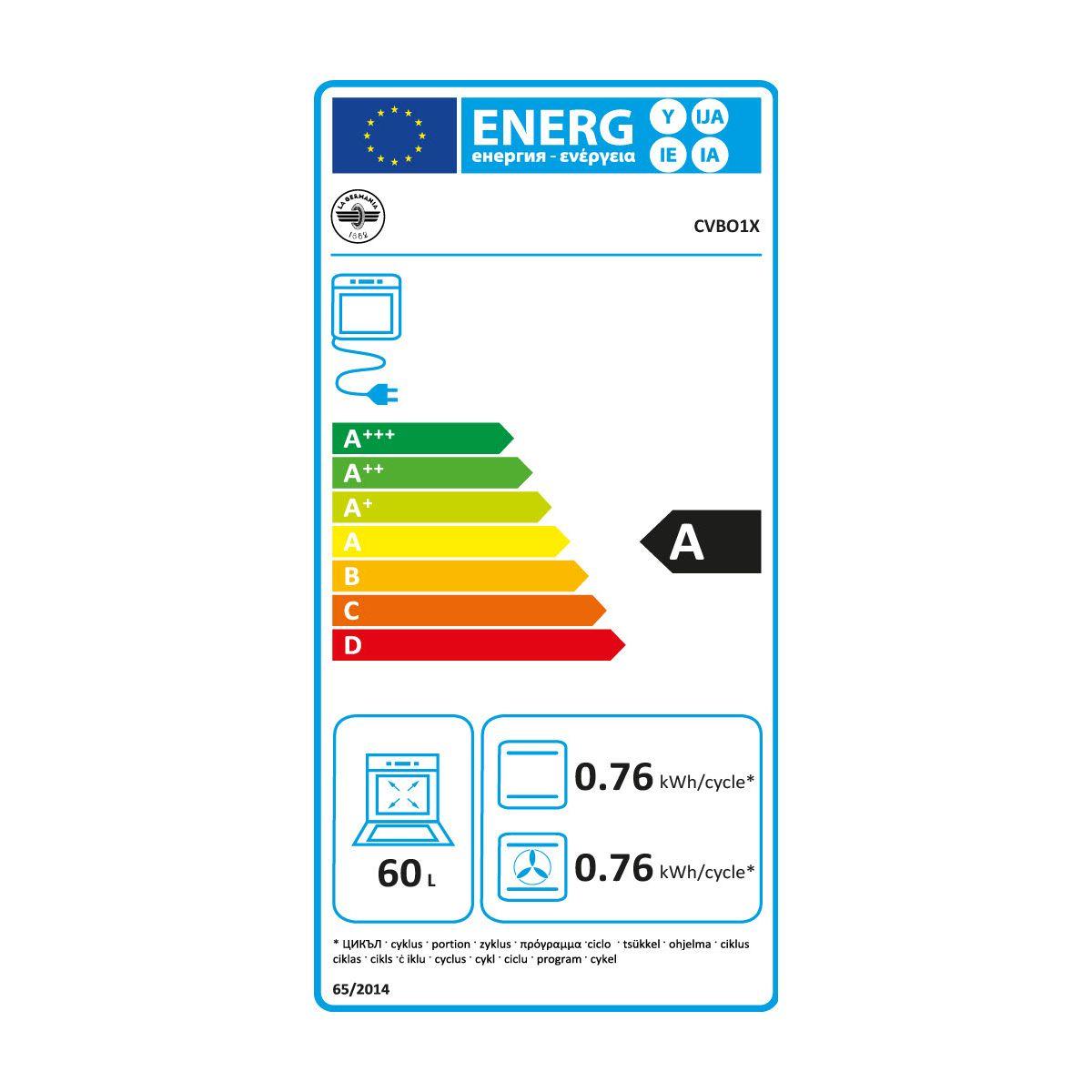 | Valeurs du label énergie | Label énergie A, Consommation en convection naturelle 0,76 kW, Consommation en chaleur tournante 0,76 kW | |