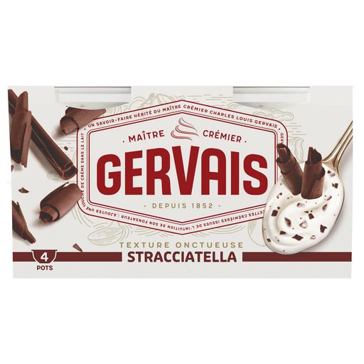 Gervais yaourt stracciatella s'inspire du savoir-faire du maître crémier Charles Gervais datant de 1852. C'est l'art de composer et de mélanger les meilleurs ingrédients tels que la douceur du lait, une crème onctueuse et de délicieux copeaux de chocolat qui fait le génie de Gervais. Gervais stracciatella est idéal pour un dessert gourmand en fin de repas ou pour les petites faims.
