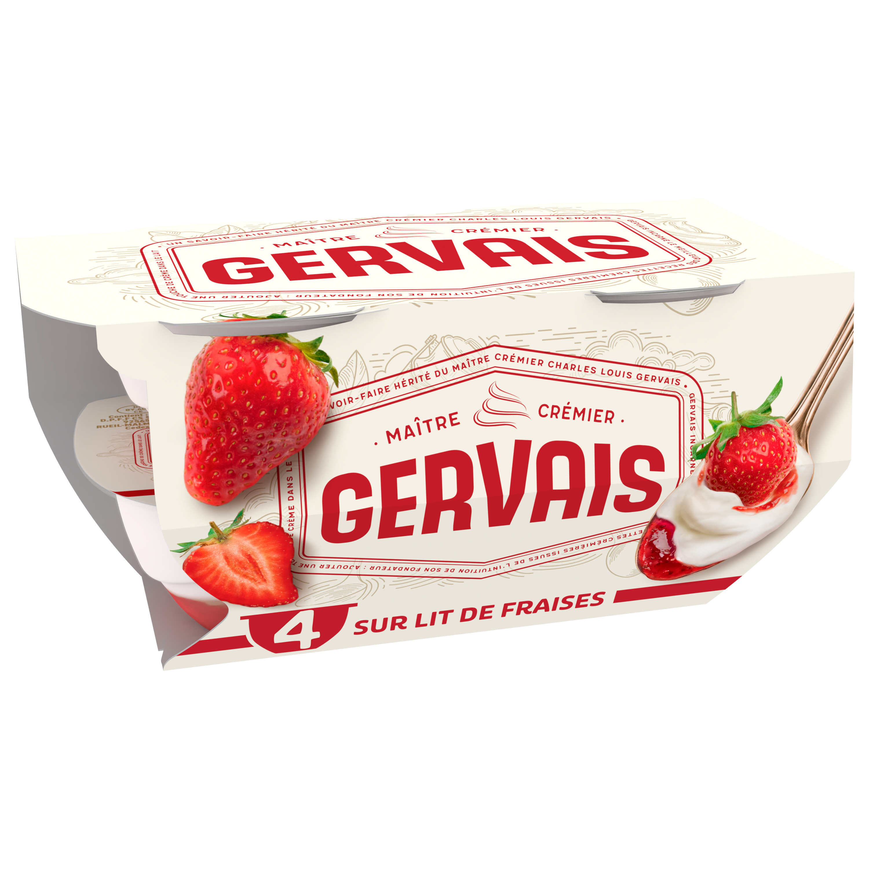Gervais yaourt sur lit de fraises s'inspire du savoir-faire du maître crémier Charles Gervais datant de 1852. C'est l'art de composer et de mélanger les meilleurs ingrédients tels que la douceur du lait, une crème onctueuse et un savoureux lit de fraises qui fait le génie de Gervais. Gervais sur lit de fraises est idéal pour un dessert gourmand en fin de repas ou pour les petites faims.