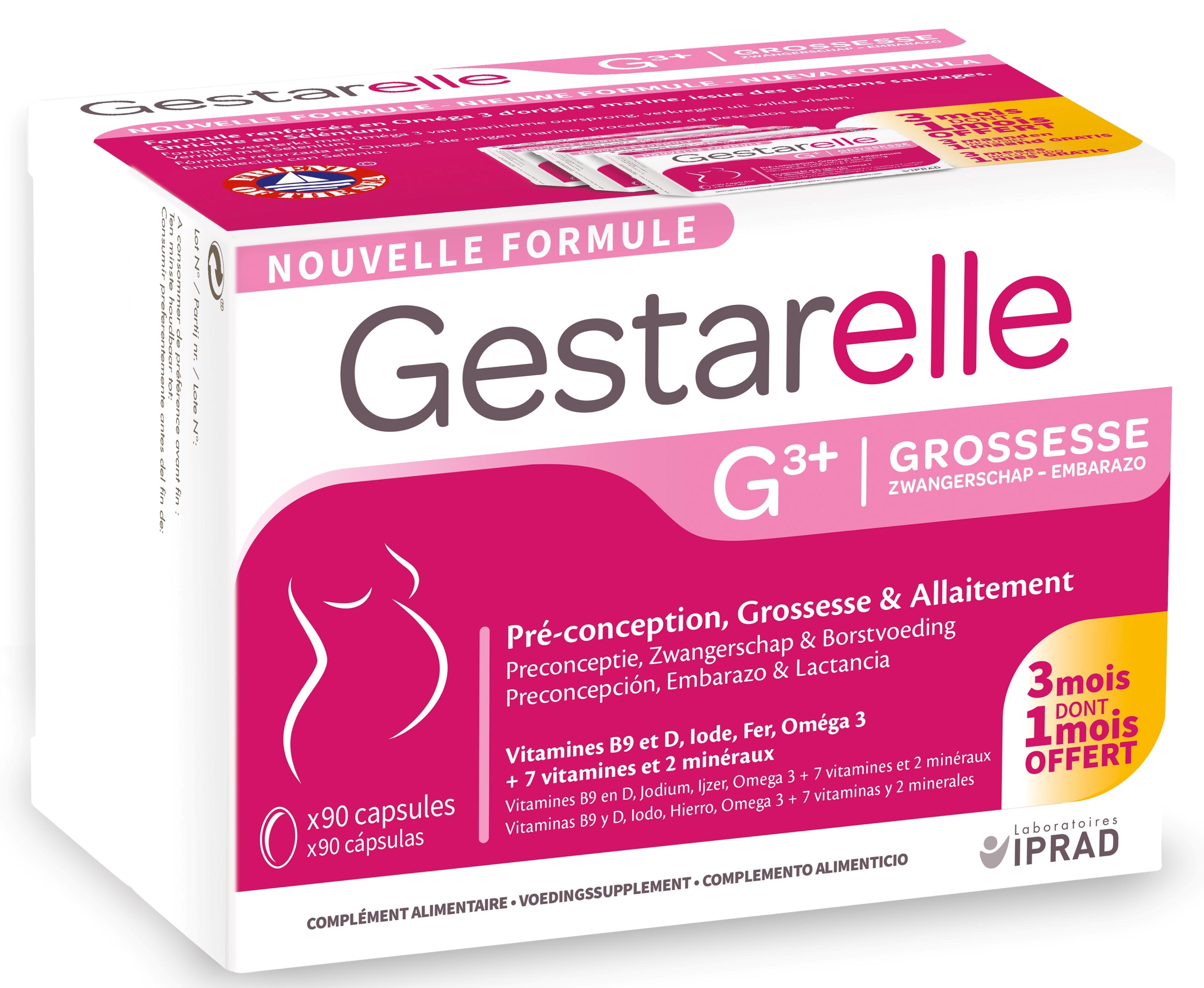 Nouvelle formule - Formule renforcée en Oméga 3 d'origine marine, issue des poissons sauvages. Enrichie en Sélénium. Composé de Vitamines B9 et D, Iode, Fer, Oméga 3 + 7 Vitamines et 2 minéraux Gestarelle G+/G3+ est recommandé dès le désir d'enfant et pendant toute la grossesse. Il est conseillé de débuter Gestarelle G+/G3+ dès la pré-conception afin d'apporter l'acide folique (Vitamine 89) quotidiennement recommandé pour préparer une bonne croissance des tissus maternels lors de la grossesse. Gestarelle G+/G3+ peut également être utilisé pendant l'allaitement. Avec une capsule par jour, Gestarelle G+/G3+ vous apporte également de nombreux autres éléments indispensables comme les acides gras essentiels (Oméga 3 purifiés et stabilisés issus d'huile de poisson), l'iode, le fer, les vitamines et oligo-éléments dont vous avez besoin.
