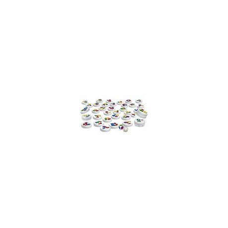 En savoir +Chacun des 36 disques étalés sur la table combine 3 symboles reproduits dans 3 couleurs différentes. A chaque tour, on lance 2 dés qui indiquent quel symbole trouver et dans quelle couleur. Puis tous les joueurs tentent simultanément de s'emparer d'un maximum de disques reproduisant cette combinaison. Les disques sont aimantés : «Clac! Clac ! » ils s'empilent comme par magie, mais on ne peut utiliser qu'une seule main ! Il faut aller très vite pour les empiler sans se tromper, sinon gare aux pénalités? Puis on entame un nouveau tour. Quand tous les disques ont été ramassés, la plus haute pile indique le vainqueur. Ayez l'oeil vif, l'esprit clair et la main habile ! Contenu : 32 disques magnétiques, 1 dé Symbole, 1 dé Couleur, règle du jeu. 2 à 6 joueurs 4 ans et + Durée 10mn