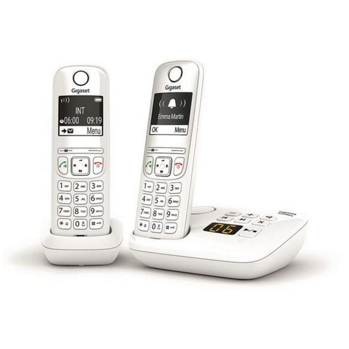 Gigaset AS690ADUOW Téléphone sans fil duo dect Gigaset AS690ADUOW avec répondeur 20 minutes. Touche de navigation 4 directions + accès direct au répertoire, à la gestion du volume, touche d?interphonie ''INT''. Son HSP (High Sound Performance). Mode Mains-libres avec son haute qualité avec volume ajustable sur 5 niveaux.