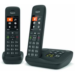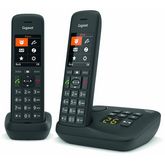 Gigaset C575ADUO Le téléphone sans fil Gigaset C575ADUO avec répondeur allie design, ergonomie et fiabilité pour un confort d'utilisation optimal. Ses formes arrondies facilitent la prise en main et lui confèrent un aspect élégant : compact à l'extérieur et plein d'astuces pratiques à l'intérieur, ce téléphone familial est fiable et convivial. Grâce à ses qualités sonores et acoustiques remarquables, les appels téléphoniques deviennent un plaisir. Le modèle Gigaset C575ADUO offre également un répondeur intégré avec 30 minutes d'enregistrement.Toutes les informations disponibles en un clin d'?il avec le Gigaset C575ADUO :Le Gigaset C575ADUO est très pratique grâce à sa navigation simple. De plus, le grand écran couleur TFT aux contrastes élevés offre de nombreux avantages : lisibilité excellente des textes, six symboles pour accéder au menu principal, ainsi qu'un mode Jumbo qui permet d'agrandir les caractères. Avec les touches éclairées bien espacées, le Gigaset C575ADUO est extraordinairement lisible et pratique.Tous vos contacts à portée de main :Le Gigaset C575ADUO permet une gestion des contacts extrêmement facile : son carnet d'adresses peut contenir jusqu'à 200 contacts, avec nom, prénom, ainsi que 3 numéros de téléphone pour chacun. Les touches de numérotation rapide vous permettent d'appeler vos contacts favoris sans avoir à composer de longs numéros ni parcourir tout le carnet d'adresses. Autre touche pratique : le rappel d'anniversaire afin de ne jamais oublier les dates clés pour ceux que vous aimez ? et grâce à la sonnerie VIP, vous reconnaîtrez facilement les appels importants. En outre, vous pouvez partager facilement les contacts de votre carnet d'adresses entre tous vos combinés Gigaset.Un téléphone personnalisable :Le Gigaset C575ADUO comprend toute une gamme d'options de personnalisation qui vous permettent d'adapter votre téléphone à vos préférences. Vous pouvez choisir votre économiseur d'écran, le thème de couleur pour l'affichage des textes ou configurer des sonneries spéciales pour les contacts les plus importants pour vous. Autre caractéristique utile : vous pouvez choisir entre 2 profils acoustiques selon le niveau sonore qui vous convient le mieux.Plus de tranquilité et de respect de votre vie privée grâce à la protection contre les appels indésirables :La fonction Blocage des appels anonymes vous garantit la tranquillité à la maison : les appels anonymes s'affichent sans sonnerie ou peuvent être totalement bloqués ? pour ne pas vous déranger. En outre, vous pouvez mettre votre téléphone en silencieux suivant certaines plages horaires. Ainsi, vous serez protégé de tout appel indésirable quand vous le souhaiterez. Les appels des contacts signalés comme VIP dans votre carnet d'adresse seront en revanche signalés normalement à tout moment.Ne manquez aucun message : le Gigaset C575ADUO avec répondeur :Le téléphone Gigaset C575ADUO est doté d'un répondeur numérique permettant d'enregistrer jusqu'à 30 minutes de messages vocaux. Vous pouvez les écouter facilement depuis le combiné ou la base quand vous le souhaitez ? et même si vous n'êtes pas chez vous, grâce à la fonction d'accès à distance. L'accès à la messagerie est très simple, que ce soit sur la base ou le combiné du Gigaset C575ADUO. Vos contacts peuvent vous laisser des messages d'une durée maximale de 170 secondes chacun, lesquels seront sauvegardés grâce à une batterie de secours en cas de coupure de courant.Gigaset C575 : toujours là quand vous en avez besoin :Vous pouvez placer le combiné sans fil et sa base où vous le souhaitez, et ajouter jusqu'à 5 combinés supplémentaires dans votre domicile. Que ce soit dans la salle de séjour, l'entrée, le bureau ou la cuisine : vous pouvez ainsi prendre les appels directement sans avoir à courir dans toute la maison. Pour cela, nous vous conseillons le combiné Gigaset C570HX.ECO DECT pour téléphoner sans émission d'ondes :Comme tous les téléphones sans fil Gigaset, le C575ADUO bénéficie de la technologie écologique ECO DECT. Lorsque ce mode est activé, les téléphones n'émettent aucune onde en mode veille, même s'il y a plusieurs combinés. Lors d'une conversation téléphonique, la puissance transmise est automatiquement ajustée en fonction de la distance entre la base et le combiné. Plus la distance vers la base est réduite, plus les émissions sont faibles. Pour une portée maximale, il est possible de désactiver à tout moment le mode ECO DECT.
