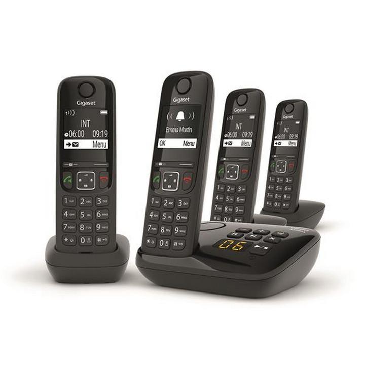 Gigaset AS690AQUATTRO La téléphone sans fil Dect Gigaset AS690AQUATTRO est une téléphone résidentiel sans fil DECT avec 3 combiné supplémentaire et répondeur 20 min. Elle est dotée de touche de navigation 4 directions avec accès direct au répertoire, à la gestion du volume, touche d?interphonie ''IN