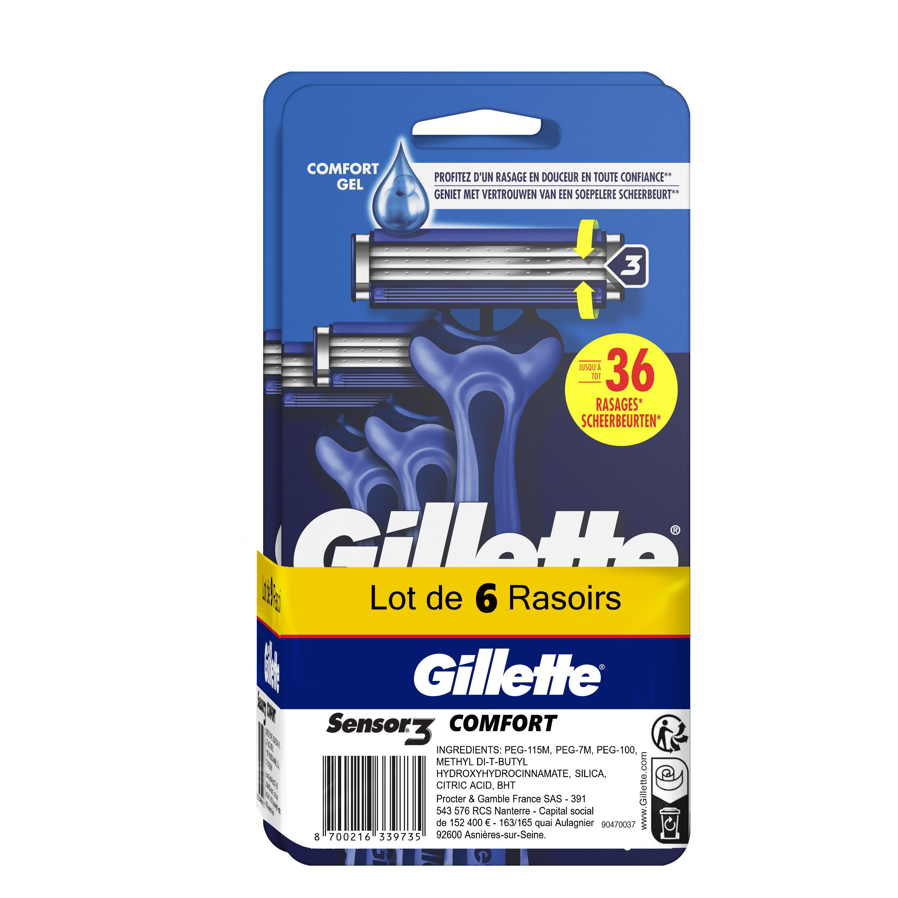 Le Gillette Sensor3 est le rasoir jetable à 3 lames le plus vendu au monde. Ces rasoirs pour homme sont dotés de lames qui s'adaptent à la peau et de la technologie ComfortGel activée par l'eau pour vous offrir un rasage plus précis et plus doux*. Des lames faciles à rincer pour un rinçage 2 fois plus efficace*. Les rasoirs jetables avec Bande Lubrifiante sont dotés d'une tête pivotante qui épouse les contours de votre visage et facilite le rasage des zones difficiles d'accès. Le rasoir jetable vous offre jusqu'à 12 rasages confortables.* par rapport au Blue/Sensor II Plus.