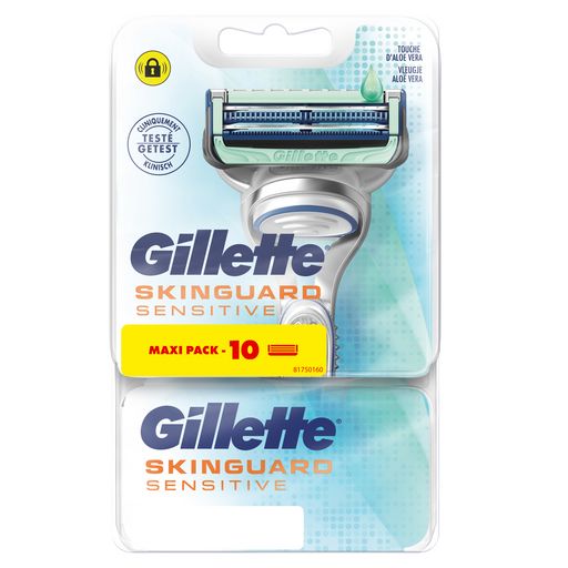 Les recharges de lames de rasoir Gillette SkinGuard Sensitive pour homme sont les premières recharges Gillette conçues spécifiquement pour les hommes à la peau sensible. Le système SkinGuard, unique en son genre, est placé entre les lames et absorbe la pression, aplatit la peau et soulève les lames pour couper les poils au niveau de la peau afin d’aider à prévenir l'irritation tout en procurant un soulagement perceptible. Des bandes lubrifiantes améliorées (par rapport au précédent SkinGuard) à l’avant et à l’arrière des lames protègent la peau contre les irritations, tandis que les 2 lames espacées de manière optimale réduisent les à-coups et les tiraillements. Le rasoir SkinGuard Sensitive, avec une touche d’aloe vera, est cliniquement prouvé pour les peaux sensibles tout en offrant le rasage fiable qu’on attend d’un rasoir Gillette.