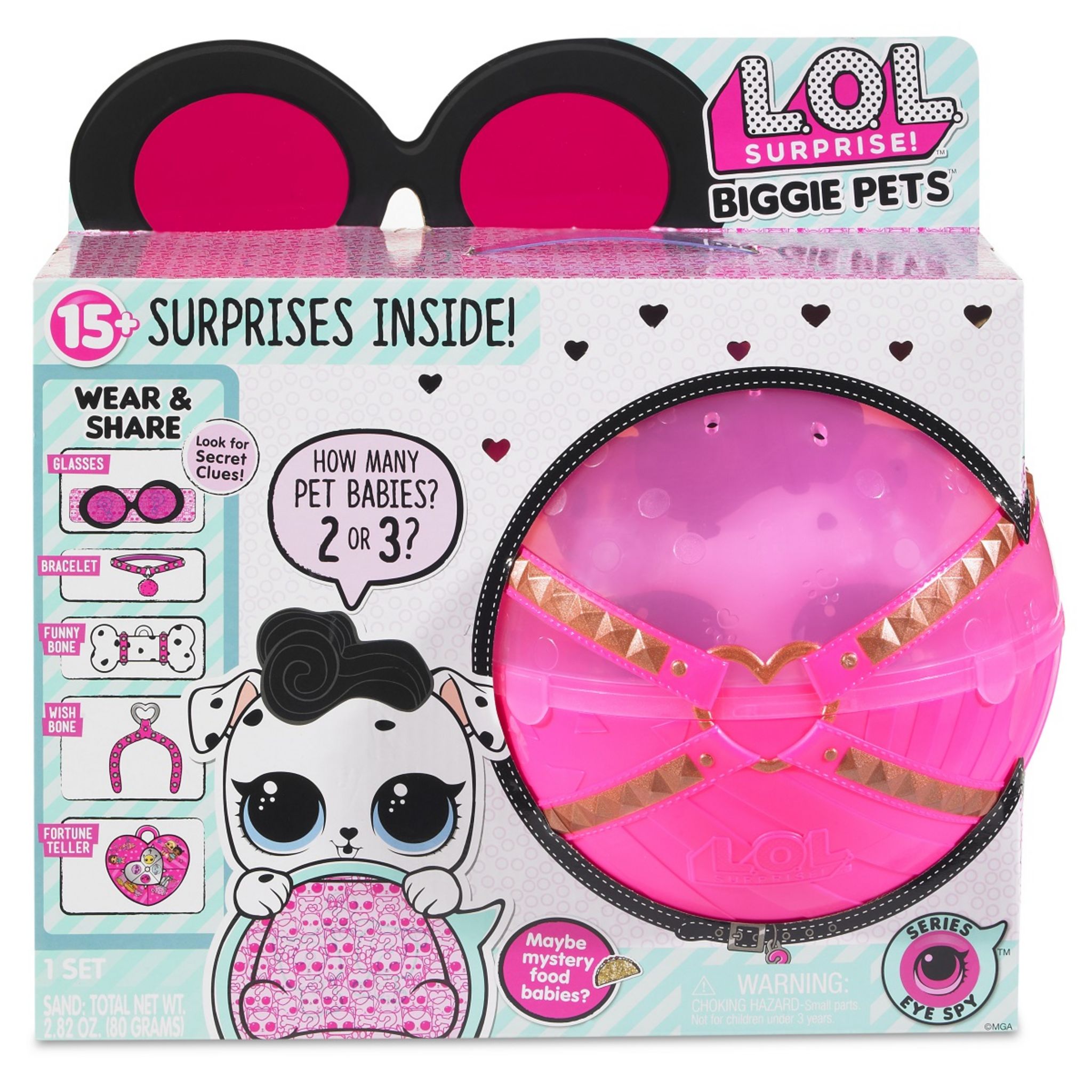 Découvre la méga boule Biggie Pets LOL Surprise ! Cette boule pouvant servir de sac à main contient une adorable figurine Biggie Pets, de nombreux accessoires à découvrir, et même une fonction surprise avec de l'eau ! Le Biggie Pets peut également être utilisé comme tirelire ou en sac à dos.