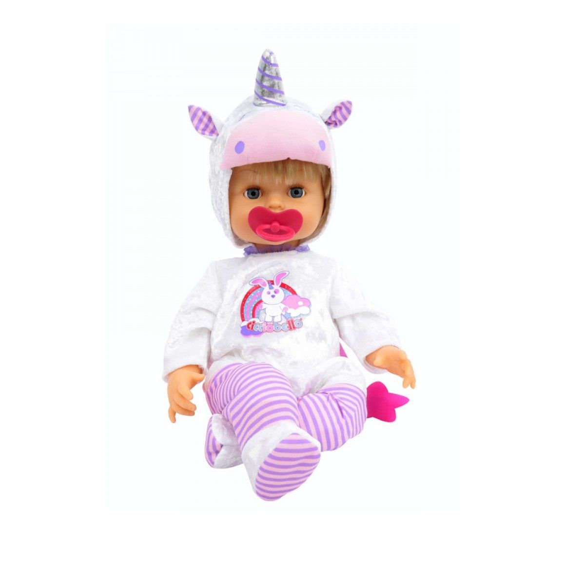 Ce poupon Cicciobello est vêtu d'une adorable tenue de licorne. Tel un véritable bébé, il peut avoir du chagrin et pleurer. Donne-lui alors sa tétine pour le calmer et fais-lui un gros câlin !