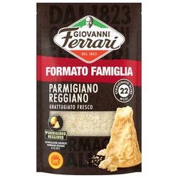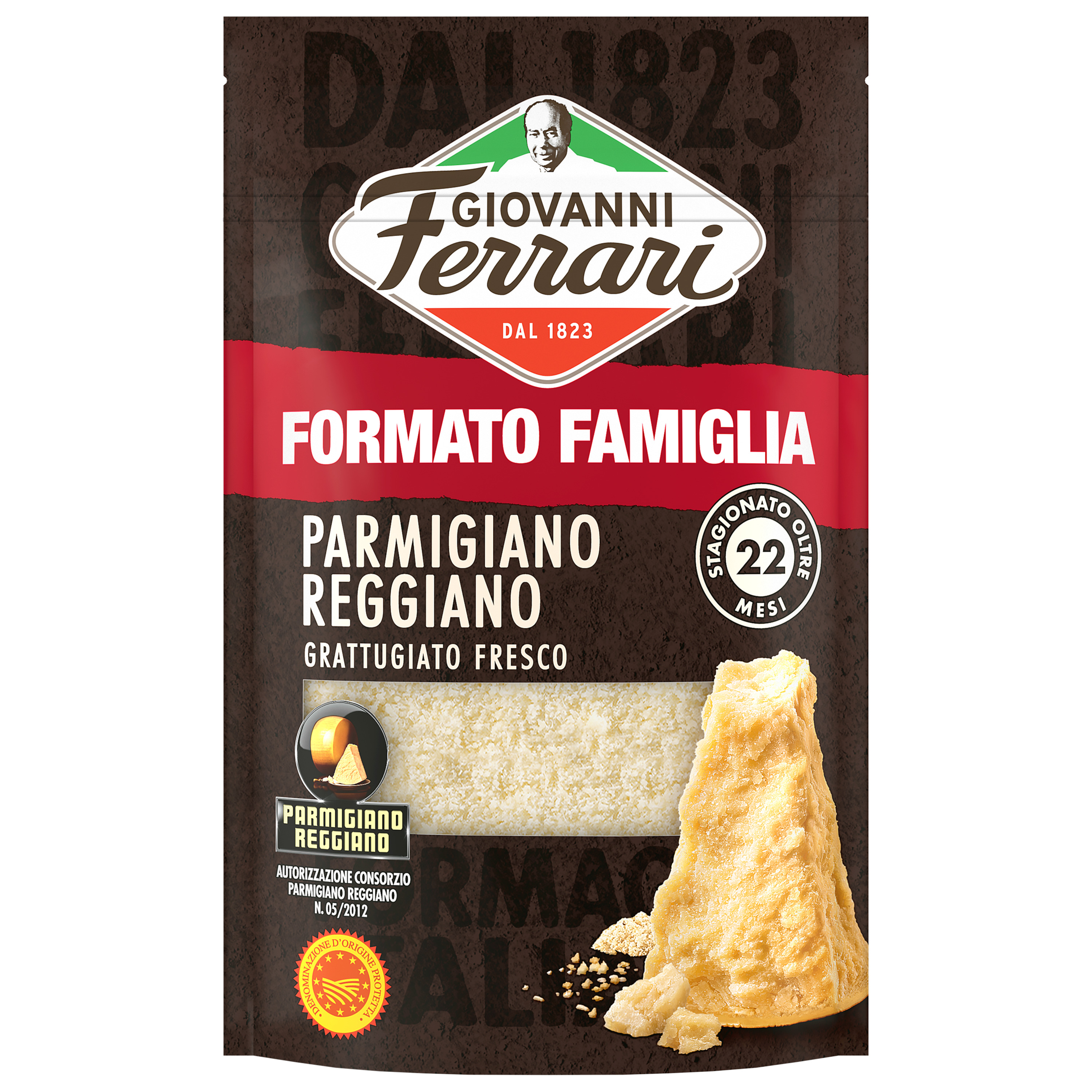 Giovanni Ferrari, héritier d'un savoir-faire de fromagers-affineurs familial datant de 1823, sélectionne avec soin ses meilleurs fromages. Affiné pendant 22 mois dans les caves de la fromagerie familiale et râpé à juste maturité, le Parmigiano Reggiano Giovanni Ferrari révèle un goût puissant et typé.