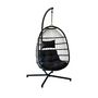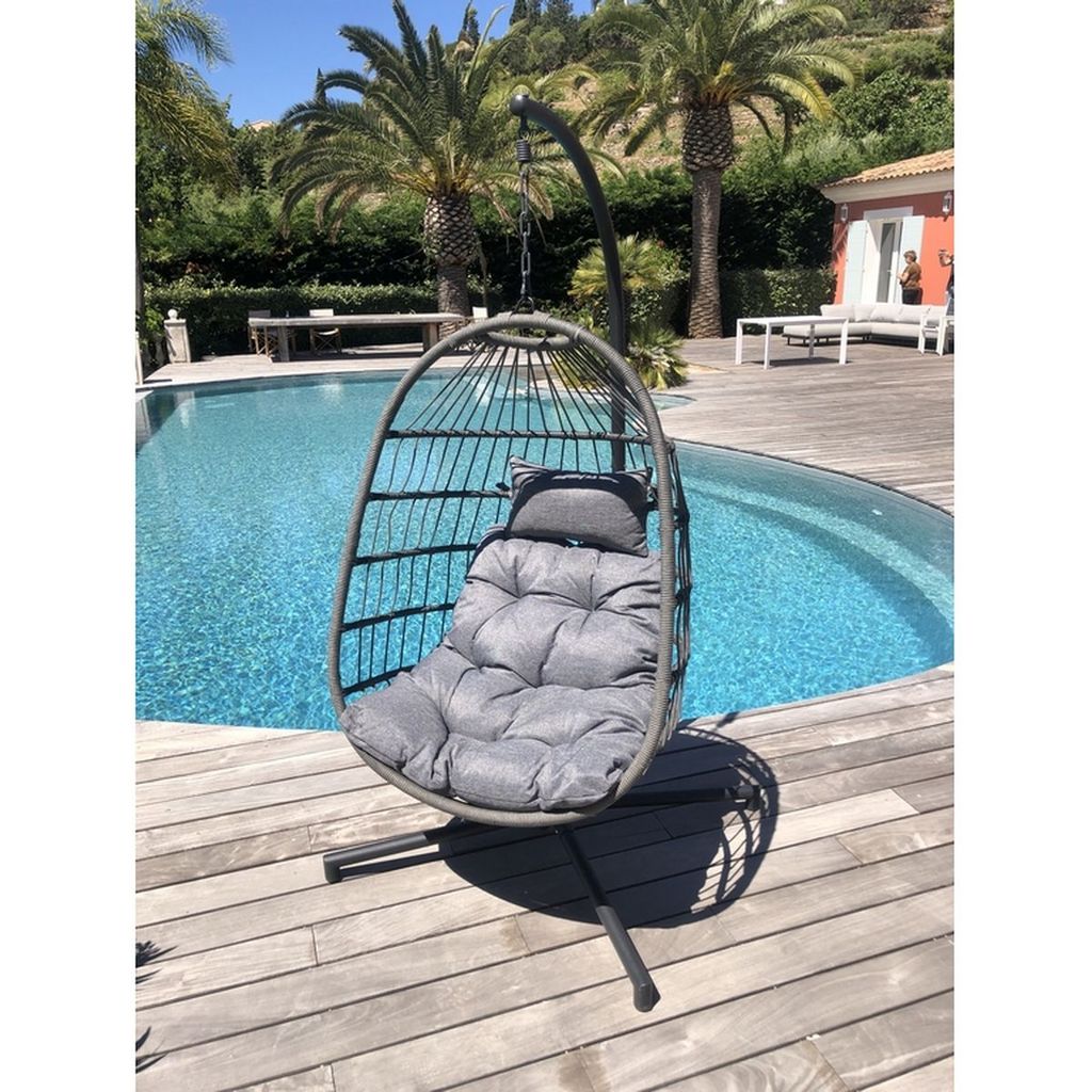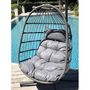 Fauteuil suspendu Oeuf PLIANT LEA Dim Œuf : 88 x 64 x H117 cm Dim Structure : base 95 x95 cm x H 195 cm Structure et cadre de panier en métal BRUN recouvert de corde et résine tréssées polyestere, Coussin étanche polyester 220gr/m² ép 15 cm