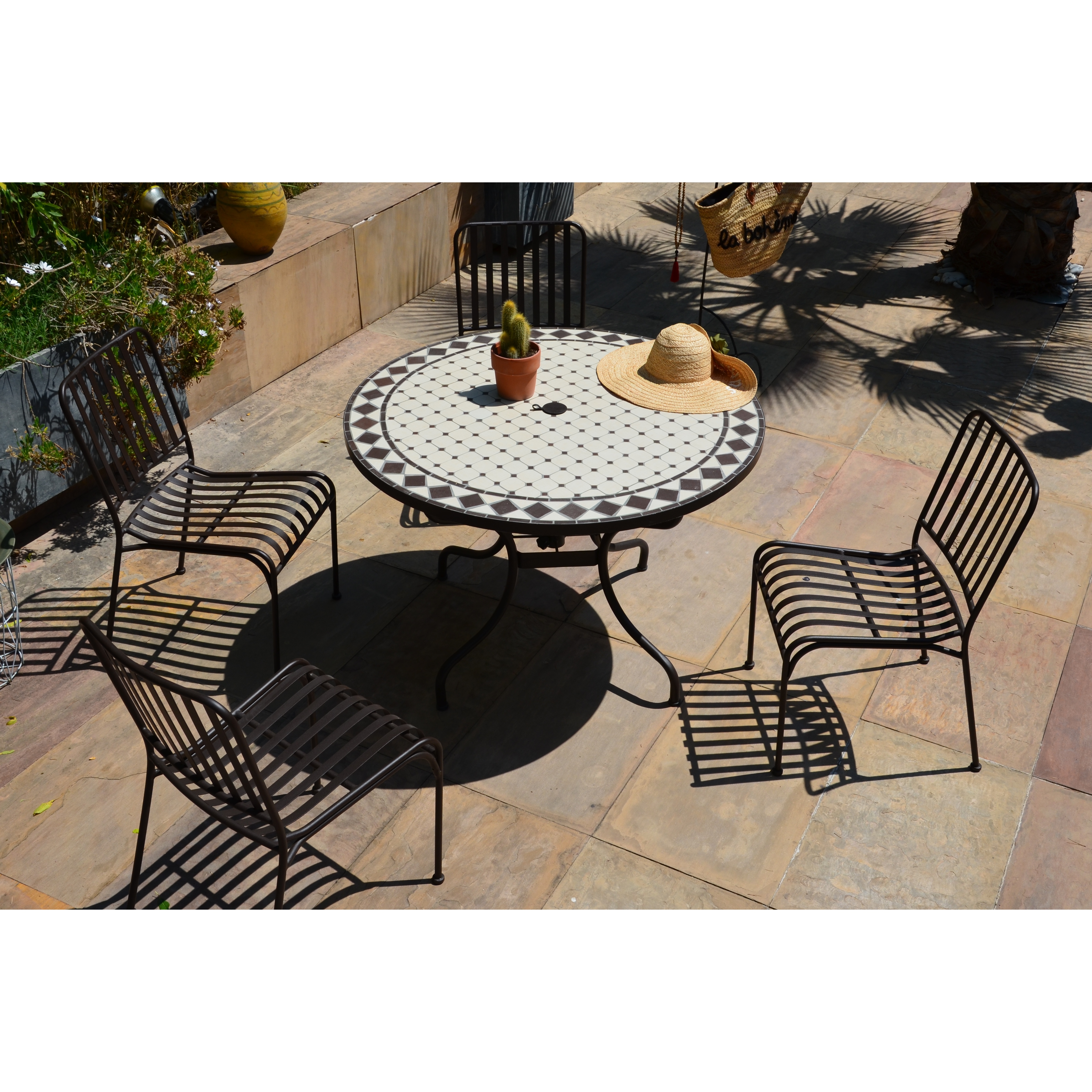 Ø 110 cm, Plateau en mosaique, Pied en metal couleur rouille demontable avec trou central pour parasol