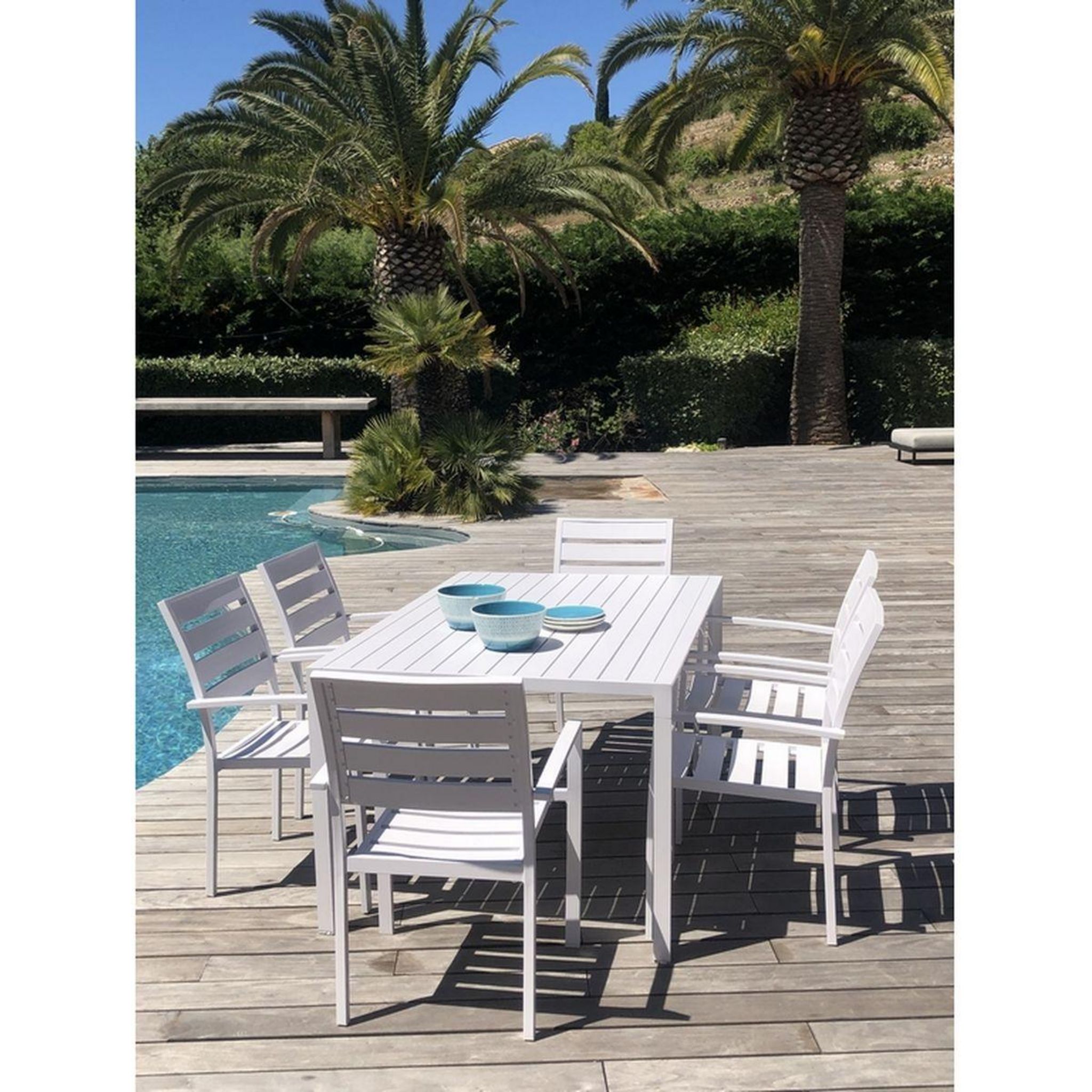 "Table ''MANUELA'' Alu rectangulaire / carrée extensible Dim : 151x100x75 cm ou 151x151x75 cm Plateau lattes aluminium blanches allonge papillon