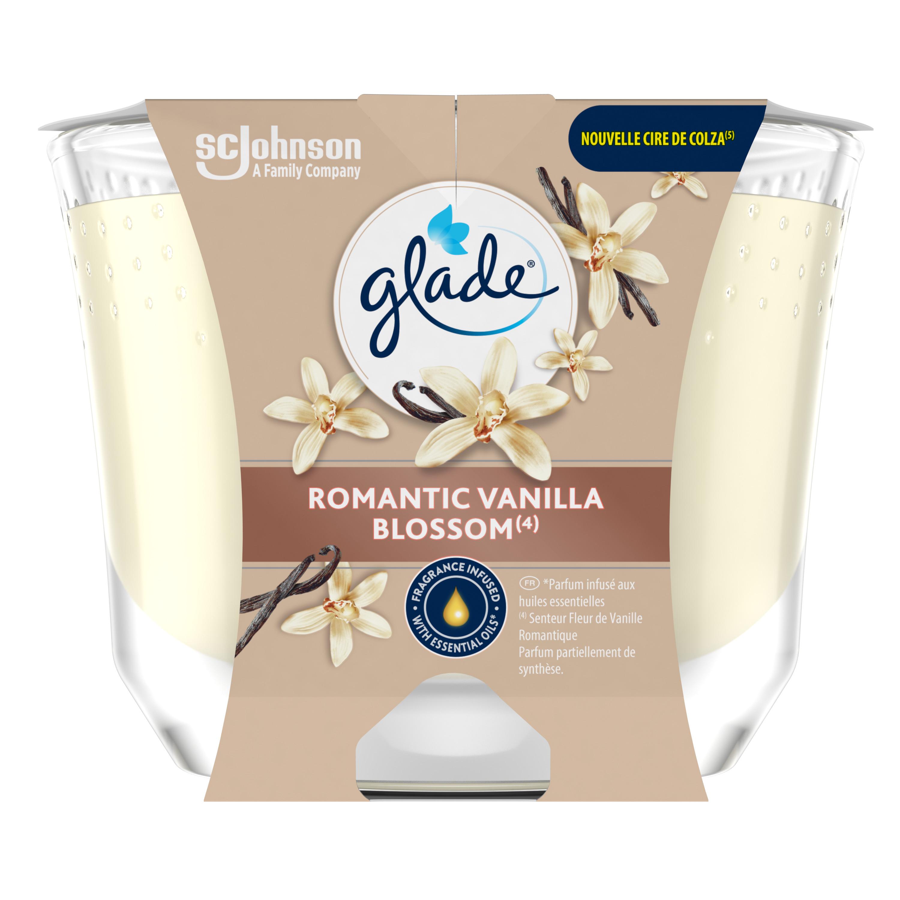 Parfumez délicatement toutes les pièces de votre maison lorsque vous le souhaitez et vivez une expérience olfactive inoubliable grâce aux bougies Glade®. Nos bougies Glade® sont formulées à partir de cire végétale et leur parfum est soigneusement élaboré par des maîtres parfumeurs pour vous proposer un moment intense et envoûtant. Elles se fondent impeccablement dans votre maison pour devenir un véritable objet de décoration intérieure. Toutes nos bougies sont certifiées Vegan. Créez une atmosphère tendre et sereine avec le parfum Romantic Vanilla Blossom aux notes de vanille, orchidée blanche et bois de santal se mêlant amoureusement pour former un parfum délicat élaboré avec soin.