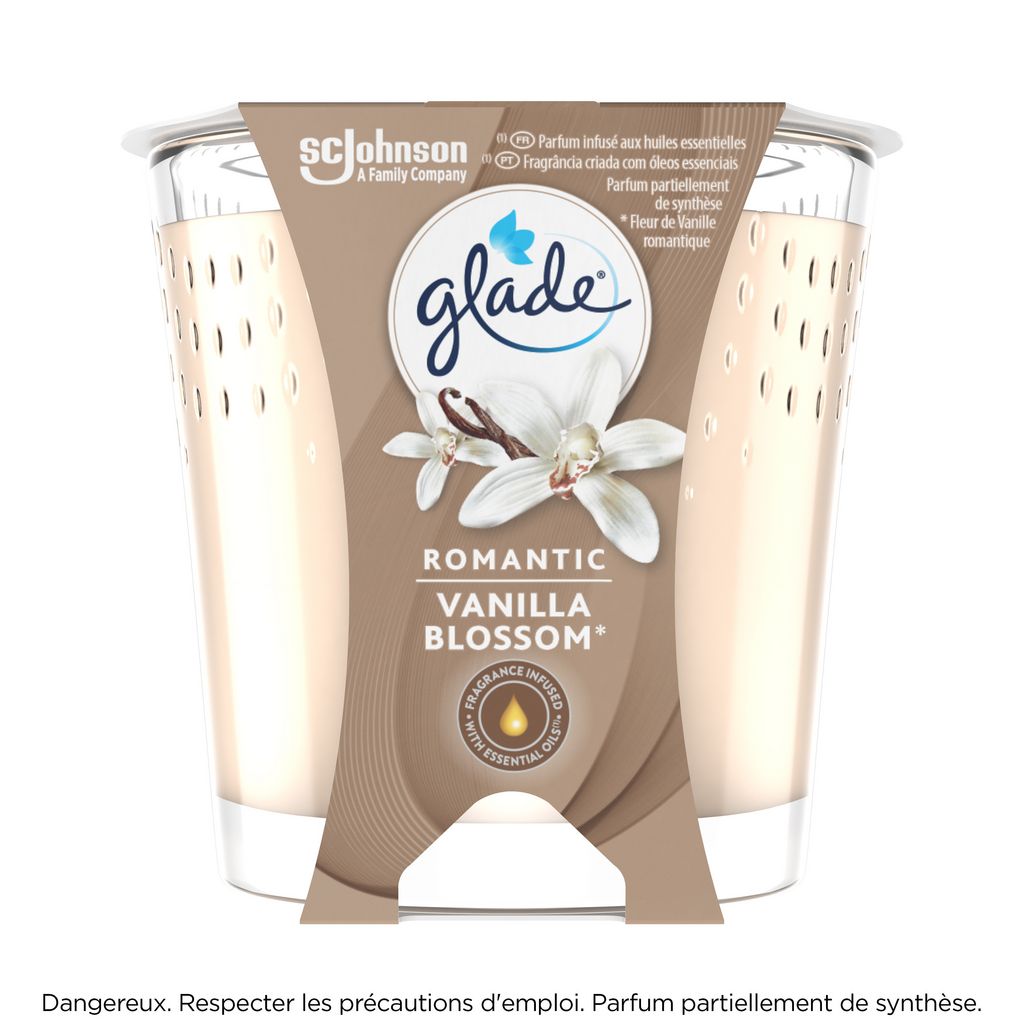 Réchauffez l’atmosphère d’une pièce avec la lueur réconfortante d’une bougie. GLADE DESIGN BOUGIE ROMANTIC VANILLA BLOSSOM