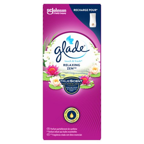 Bénéficiez d'un parfum frais instantanément grâce au diffuseur Touch & Fresh Glade®, conçus pour combattre les odeurs les plus tenaces grâce à une formule concentrée qui ne laisse pas de résidus humides. Nos diffuseurs Touch & Fresh sont garantis TrueScent Technology™ pour assurer une sensation durable de propreté grâce à un mélange exclusif d'ingrédients. Leur formule assure 2x plus de fraîcheur que les aérosols Glade® classique. Ils se fondent impeccablement à la décoration de vos toilettes et salles de bains. Vivez un véritable instant de détente grâce aux notes apaisantes de fleur de lotus, muguet et nénuphar très justement combinées avec la chaleur du bois de santal dans le parfum Relaxing Zen™.