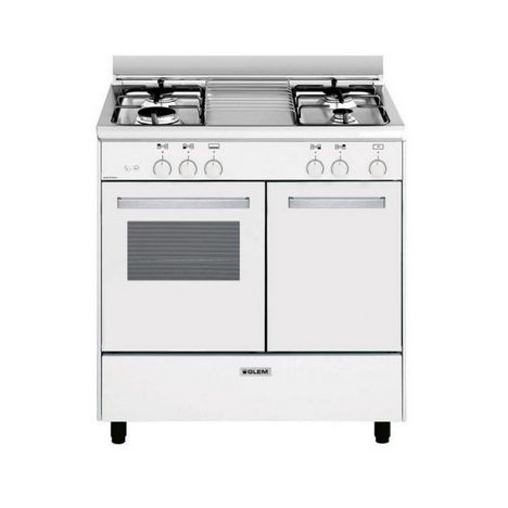 Glem GA85PMWH Cuisinière Butanette GLEM GA 85 PMWH.Four gaz.2 modes de cuisson.Cavité émail lisse Titanium: la faible porosité de l'émail en facilite le.Minuteur sonore 60min.Contre-porte plein verre.Porte 2 vitres avec vitre intérieure démontable.Ventilateur tangentiel aspiré: l'air chaud du four est rejeté sur l'arrière, pas de souffle d'air en façade - Table de cuisson finition inox.Allumage de la table intégré aux manettes.4 brûleurs dont 1 rapide 3kW.Sécurité gaz par thermocouple.1 repose-plat central en fils d'inox.Grilles émaillées matEspace de rangement pour bouteille gaz (L32xH62xP40cm).2 étagères pour transformer l'espace bouteille en meuble sont livrées de série.Coffre de rangement chauffe-plat.Léger décalage des pieds à l'arrière prévu pour le passage d'une plinthe.