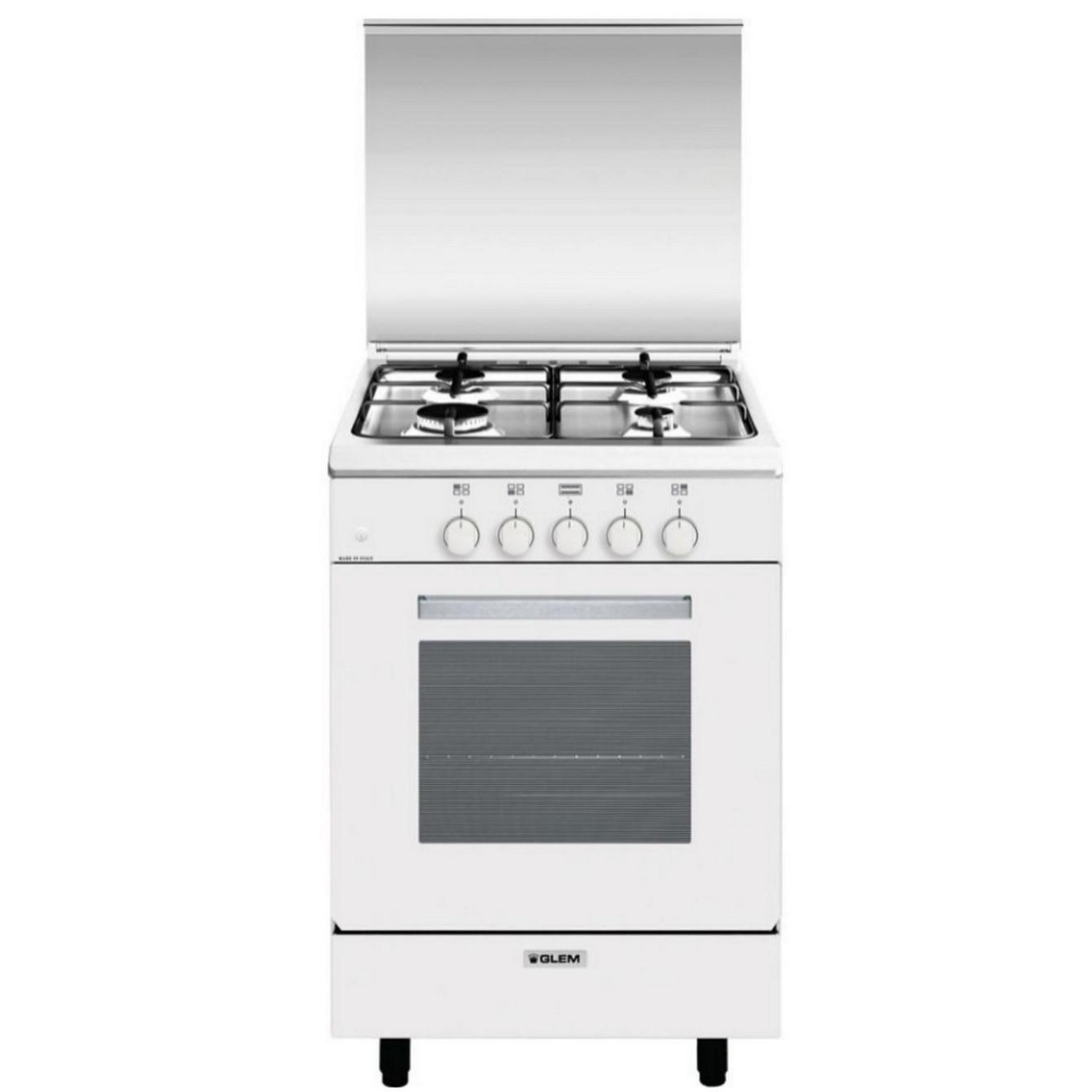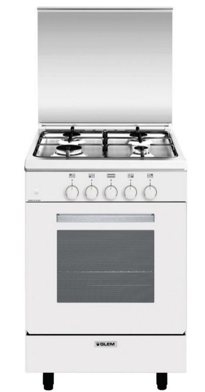 Glem GA551GWH Cuisinière gaz Glem GA551GWH - Four gaz - Gril gaz 2 kW - Cavité émail lisse Titanium : la faible porosité de l'émail en facilite le nettoyage - Porte 2 vitres avec vitre intérieure démontable - Contre-porte plein verre - Eclairage - Table de cuisson en inox - 4 brûleurs gaz dont 1 rapide 3 kW - Sécurité gaz par thermocouple - Grilles émaillées mates - Couvercle verre amovible - Pieds réglables en hauteur.