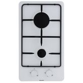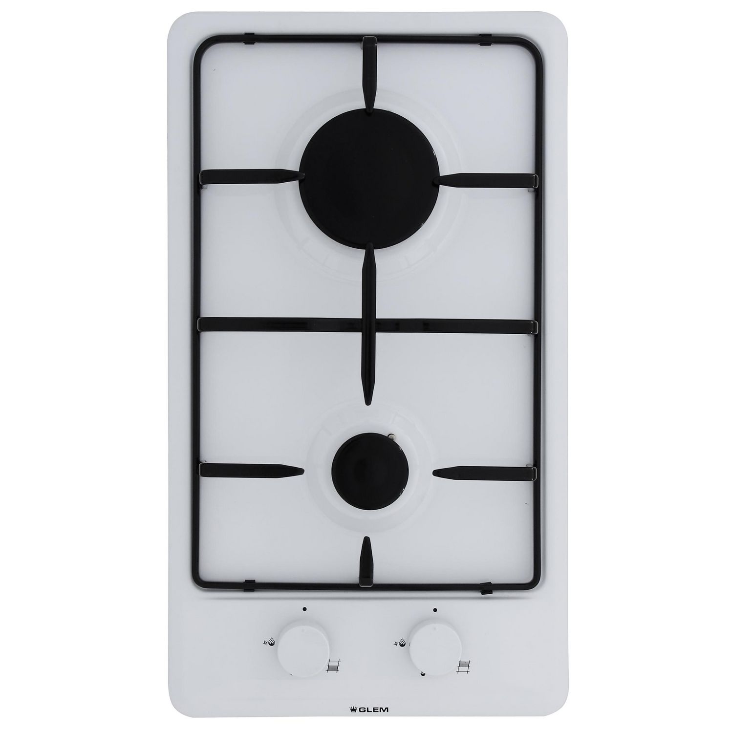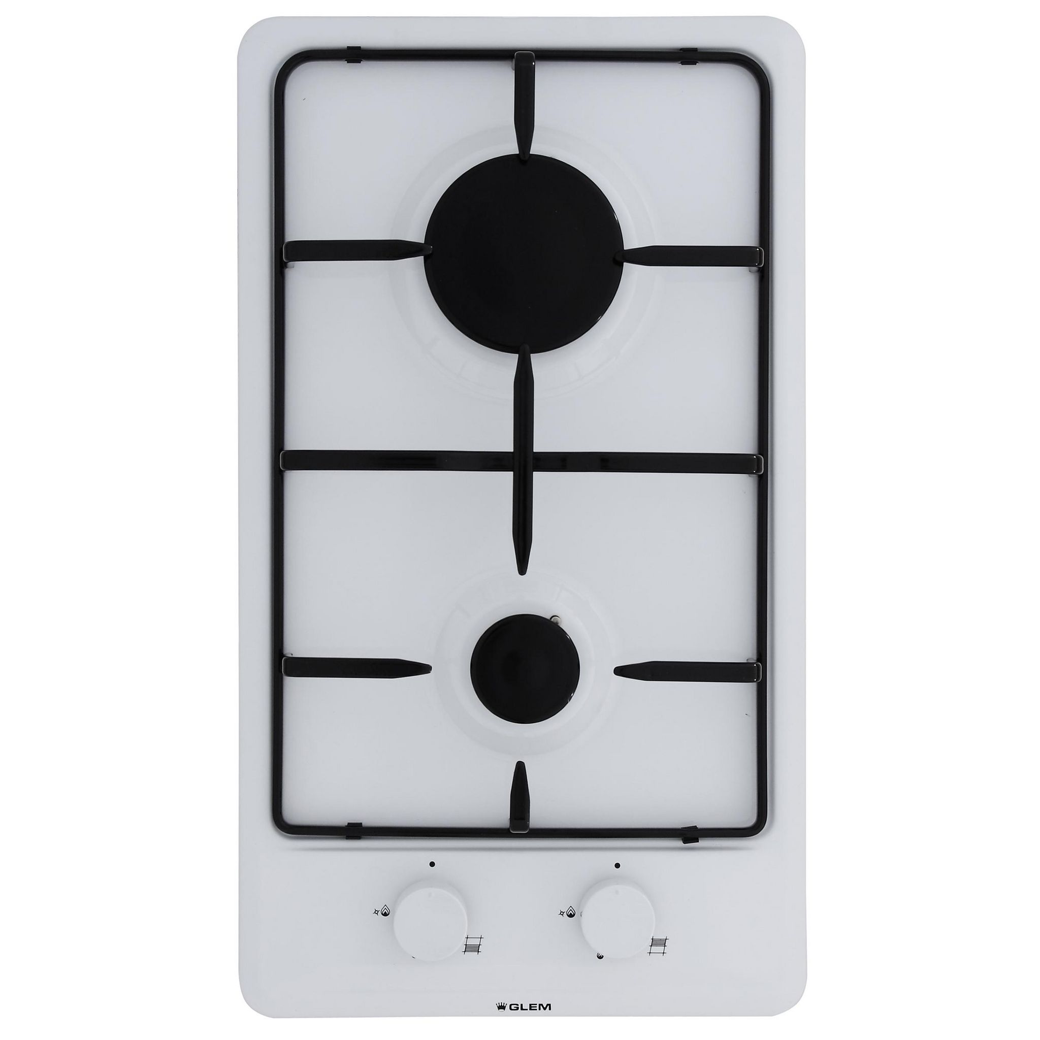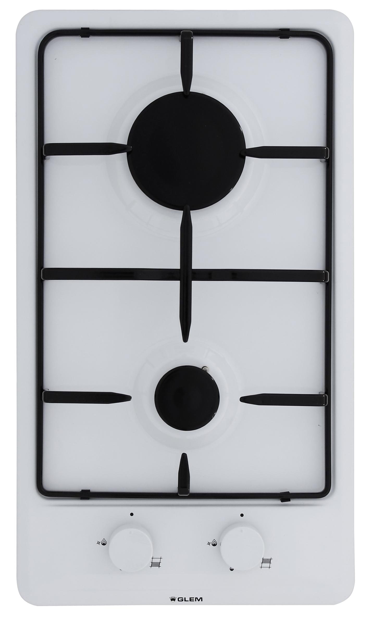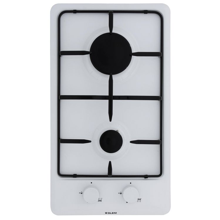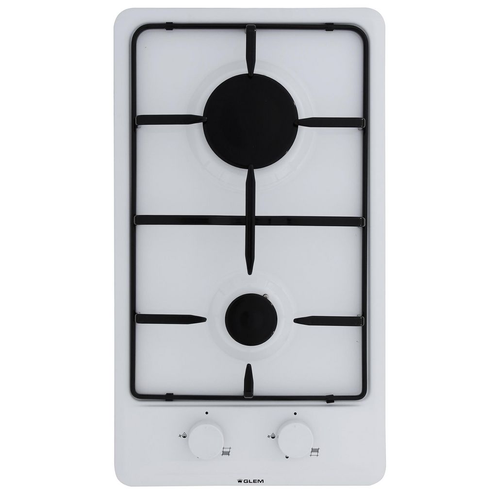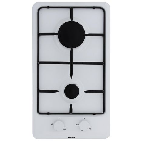 Glem GT32WH Table domino gaz Glem GT32WH.- 2 brûleurs dont 1 rapide 3 kW.- Allumage intégré aux manettes.- Sécurité gaz par thermocouple.- Grille émaillée.- Commandes frontales.- Joint d'étanchéité fourni.- Finition blanc. - Type de Produit : Table de cuisson au gaz - 2 plaques de cuisson.Couleur :