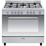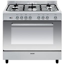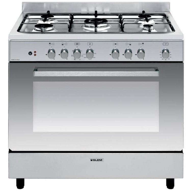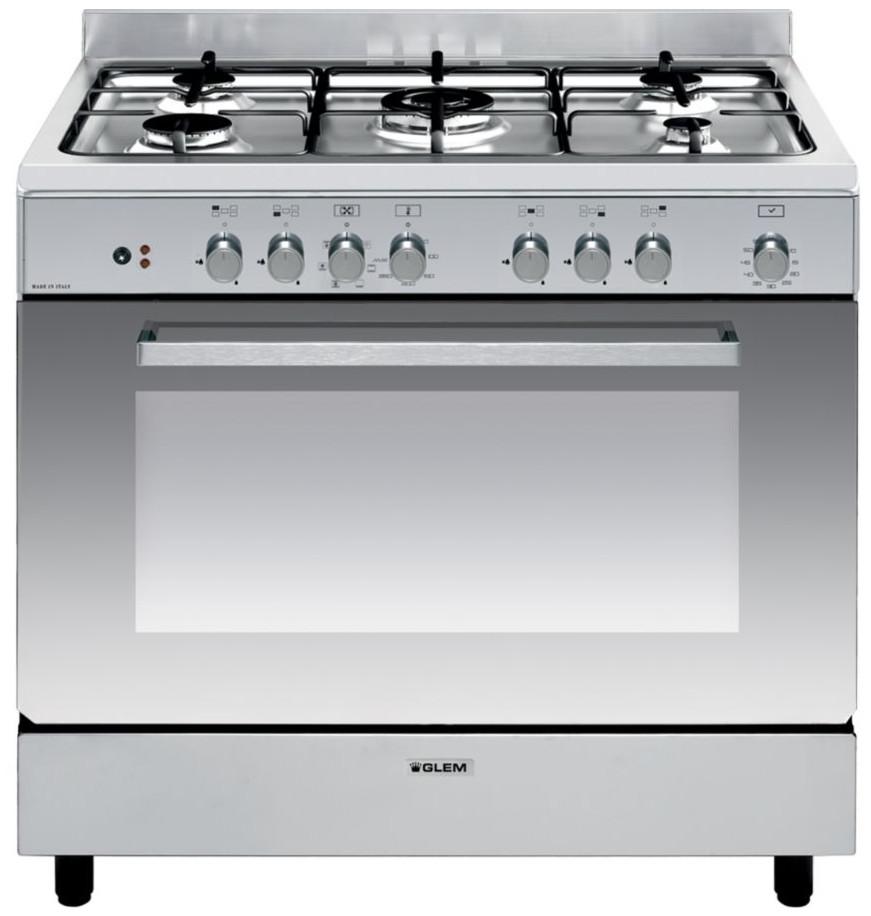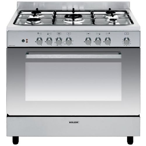 Glem GE960CBIX2 Piano de cuisson mixte e-Cooker Glem GE960CBIX2 doté d'un four électrique avec 5 modes de cuisson dont Maxi Gril pulsé et Chaleur brassé, gradins fils, panneaux catalytiques autonettoyants, contre-porte plein verre avec verre démontable, porte 2 vitres, ventilateur tangentiel aspiré : l'air chaud du four est rejeté sur l'arrière, pas de souffle d'air en façade et une table de cuisson avec allumage électronique, 5 brûleurs dont 1 triple couronne 3,8 kW, sécurité gaz par thermocouple, grilles émaillées mates. Ce piano de cuisson est homologué pour être encastré entre deux meubles de cuisine, selon la norme UNI EN 30-1-1 alte 2.