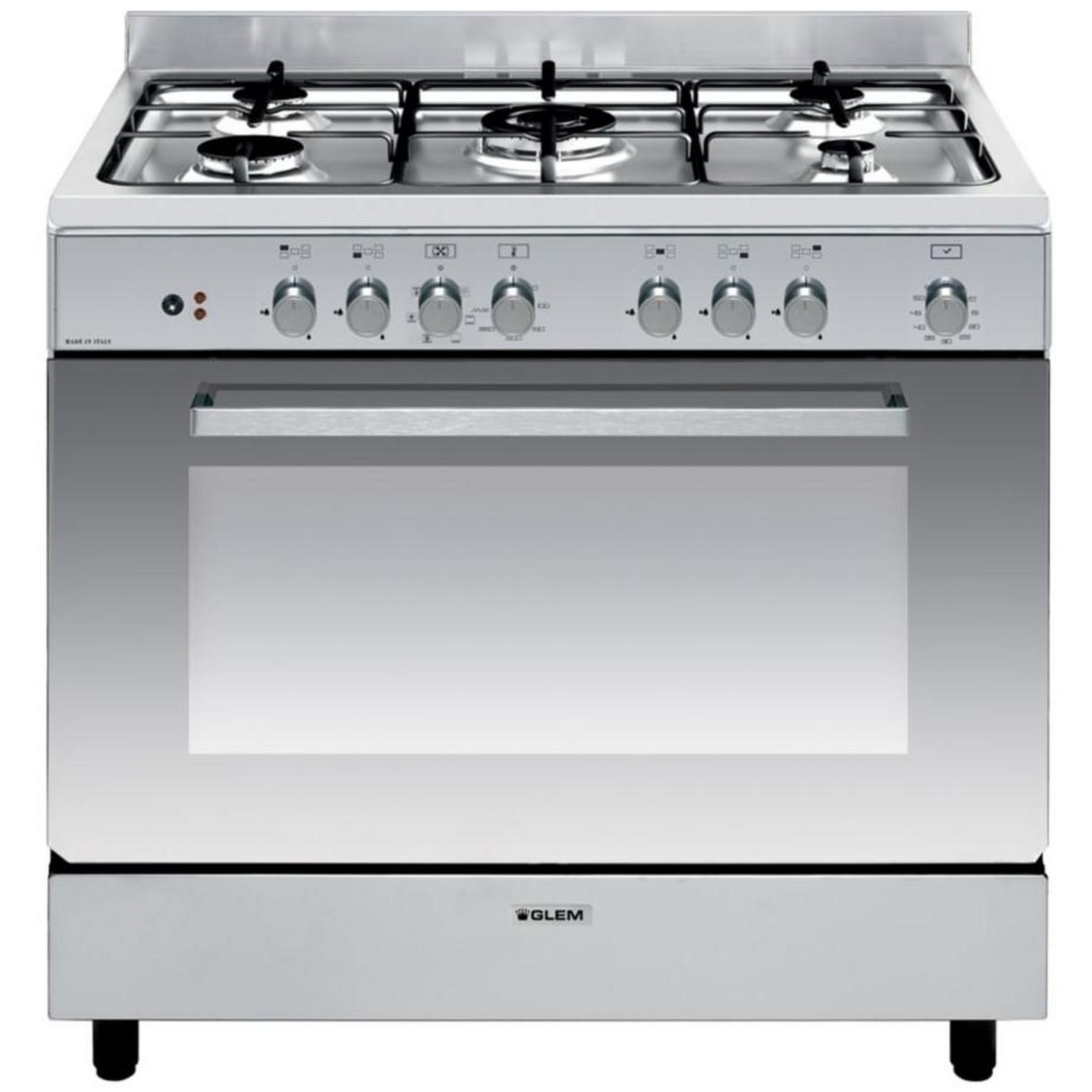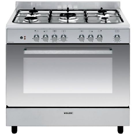 Glem GE960CBIX2 Piano de cuisson mixte e-Cooker Glem GE960CBIX2 doté d'un four électrique avec 5 modes de cuisson dont Maxi Gril pulsé et Chaleur brassé, gradins fils, panneaux catalytiques autonettoyants, contre-porte plein verre avec verre démontable, porte 2 vitres, ventilateur tangentiel aspiré