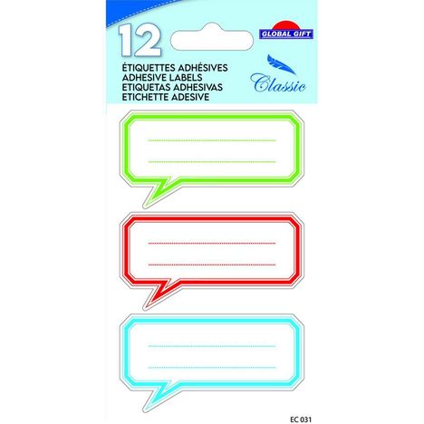 Les étiquettes adhésives de Global Gift en forme de bulle de conversation colorées sont idéales pour ajouter une touche de couleur et d'originalité aux fournitures scolaires et aux paquets cadeaux. Ce paquet d'étiquettes fantaisies contient 4 feuilles de 3 étiquettes, soit 12 au total. Les étiquettes autocollantes ont aussi de multi-usages et sont personnalisables. Leur adhésion est résistante et se collent facilement où vous le souhaitez comme un alteur, un cahier, un livre, une chemise plastique ou encore un emballage cadeau. Le design des étiquettes est unique et créé en France. La rentrée des altes sera super ! Les 12 autocollants sont disposés sur 4 pages de 12 x 8 cm.