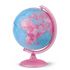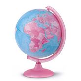 Globe lumineux en plastique pour apprendre la géographie et rêver d'aventures. Socle et méridien satiné rose. Chaque pays est représenté dans une nuance distincte de rose. Remplacement des ampoules facile.