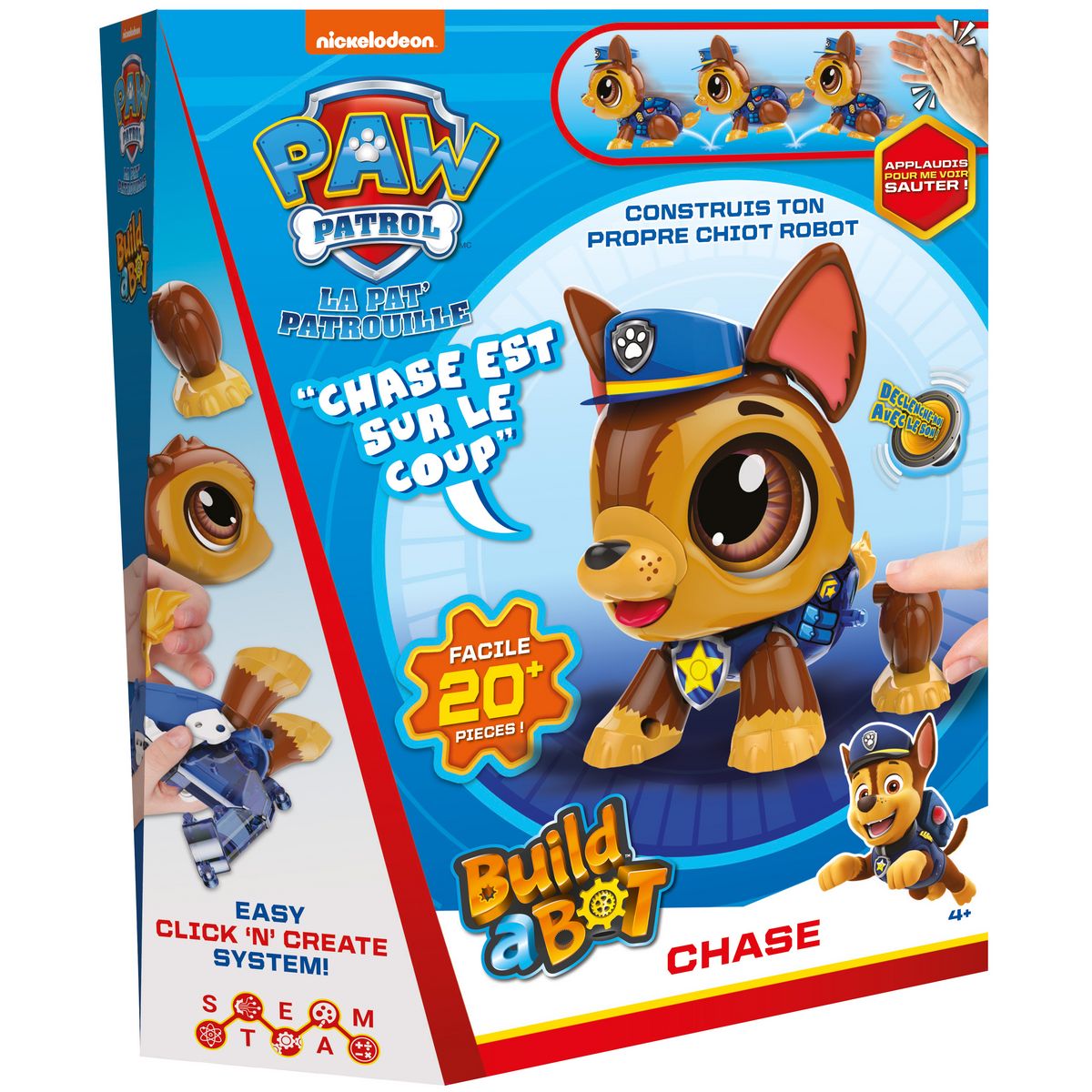 Build A Bot Paw Patrol Chase :Assemble les pièces et créé ton propre compagnon robot Pat Patrouille ! Apprends en t’amusant et découvre le fonctionnement du son, des moteurs ou encore des engrenages. Une fois assemblé personnalise ton chiot et joue avec lui ! Fonctions sonores et motrices avec les voix du dessin animé. Dès 3 ans.