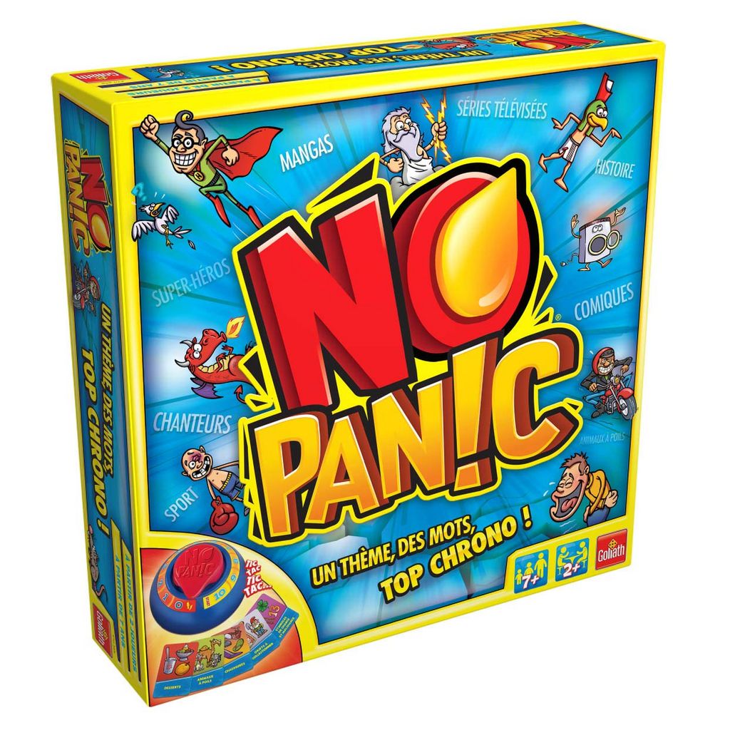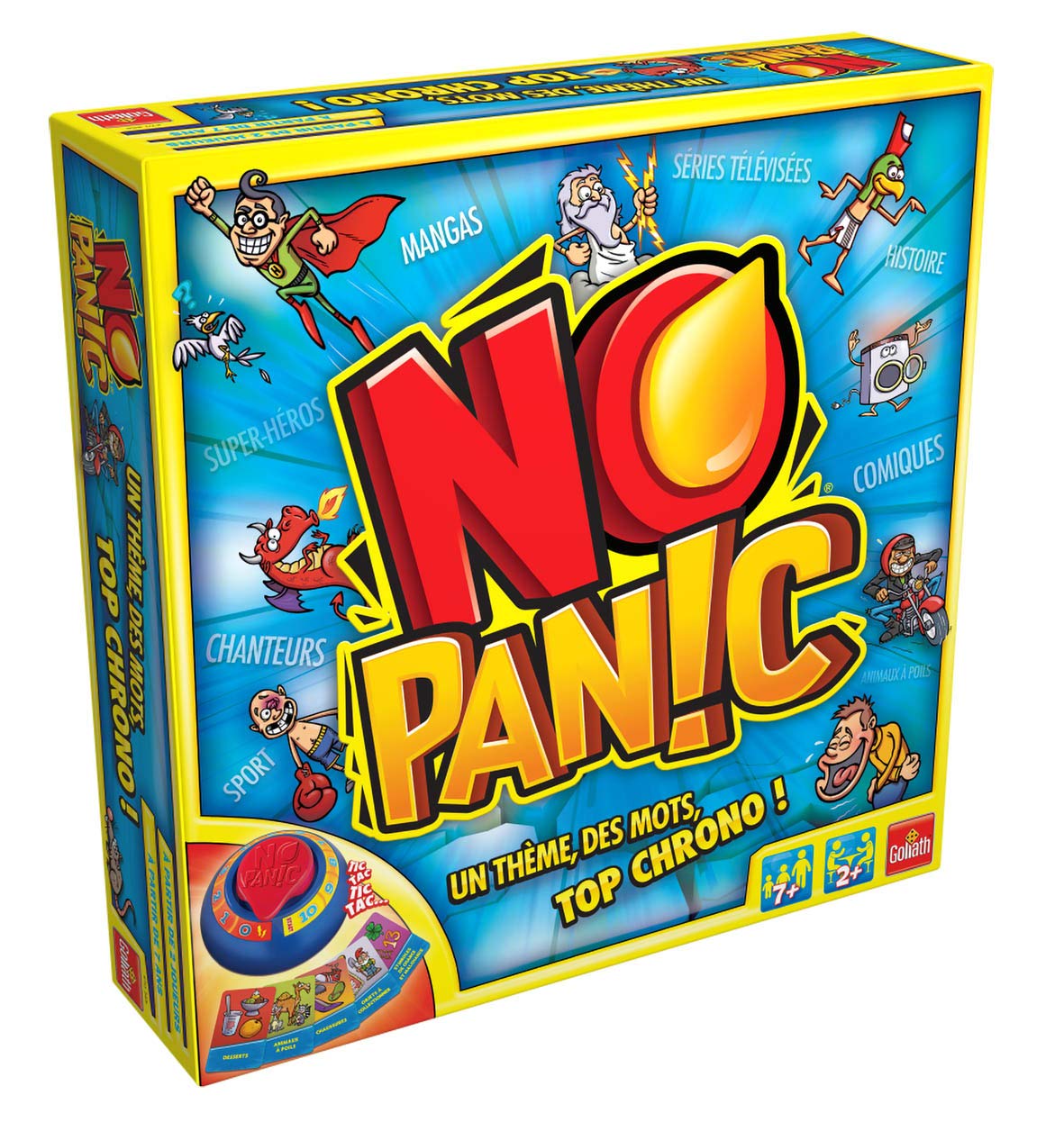 Dans No Panic de Goliath, il faut trouver des mots en rapport à des thèmes le plus vite possible. Garderez-vous votre sang froid quand le minuteur infernal se déclenchera ? Un jeu d'ambiance familial au rythme infernal pour toute la famille avec 2 niveaux de difficulté au choix pour s'adapter à l'âg