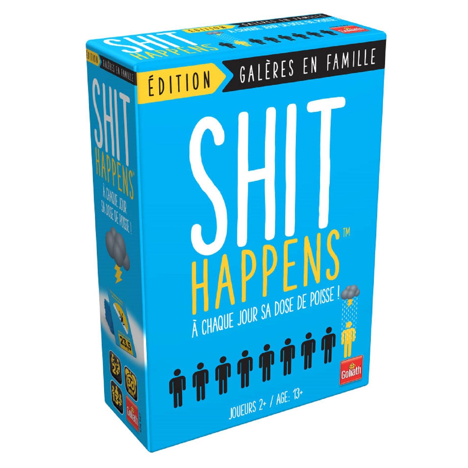 Shit happens family est le jeu idéal pour passer une soirée délirante en famille ! L'objectif de la partie est d'estimer correctement le niveau de galère des cartes qui vous sont proposées et en placer 10 sur ton Shit'o'Mètre ! Attention, les cartes relatent des situations infernales !
