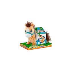 La peluche interactive 'Pumpkin' de la marque Goliath est un adorable poney brun et beige qui réagit au toucher. En appuyant sur sa tête, elle émet des sons joyeux et agite sa queue comme un vrai cheval. Fabriquée en tissu doux, cette peluche est conçue pour offrir une expérience de jeu immersive et