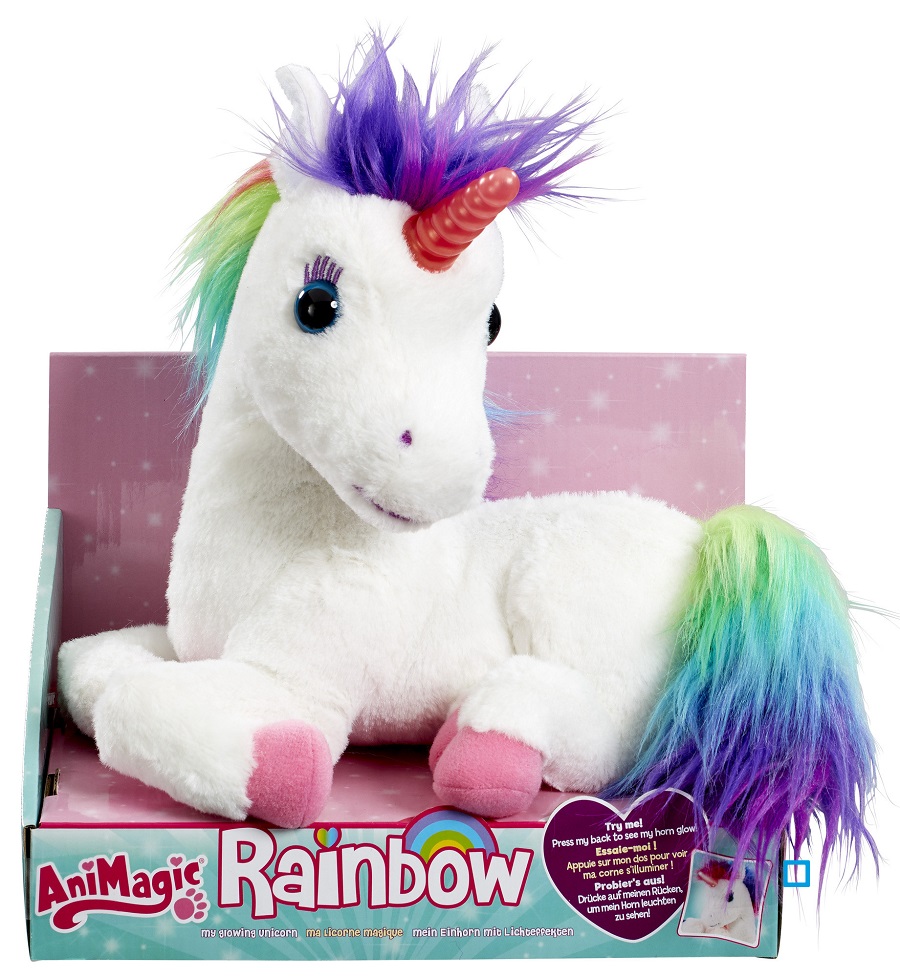 Caresse ta licorne Rainbow, elle adore les câlins. Lorsque tu caresses son dos, ta douce licorne Rainbow henni et émet des sons magique ! Sa corne s'illumine et change de couleur lorsque tu la câline !