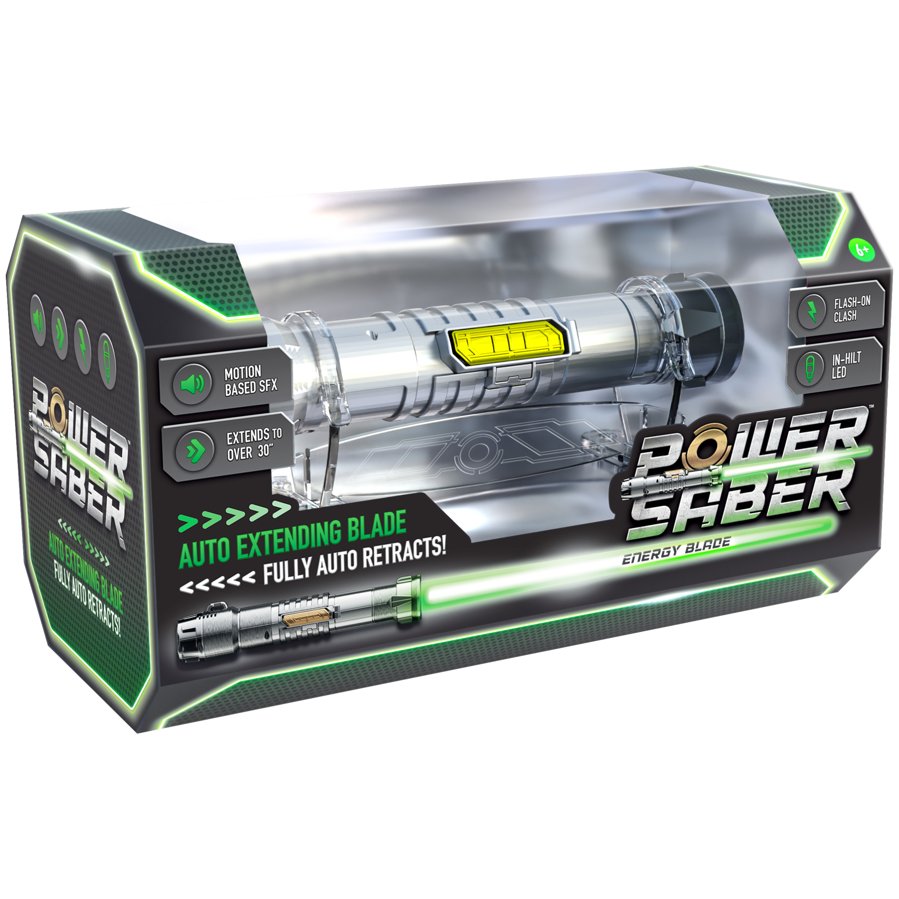 Découvrez le Power Sabre Energy Blade en vert, un jouet futuriste conçu pour les fans d'action et d'aventure. Ce sabre énergétique est équipé d'une lame qui s'étend automatiquement jusqu'à plus de 76 cm et se rétracte complètement sur simple pression d'un bouton, offrant une expérience de combat ré