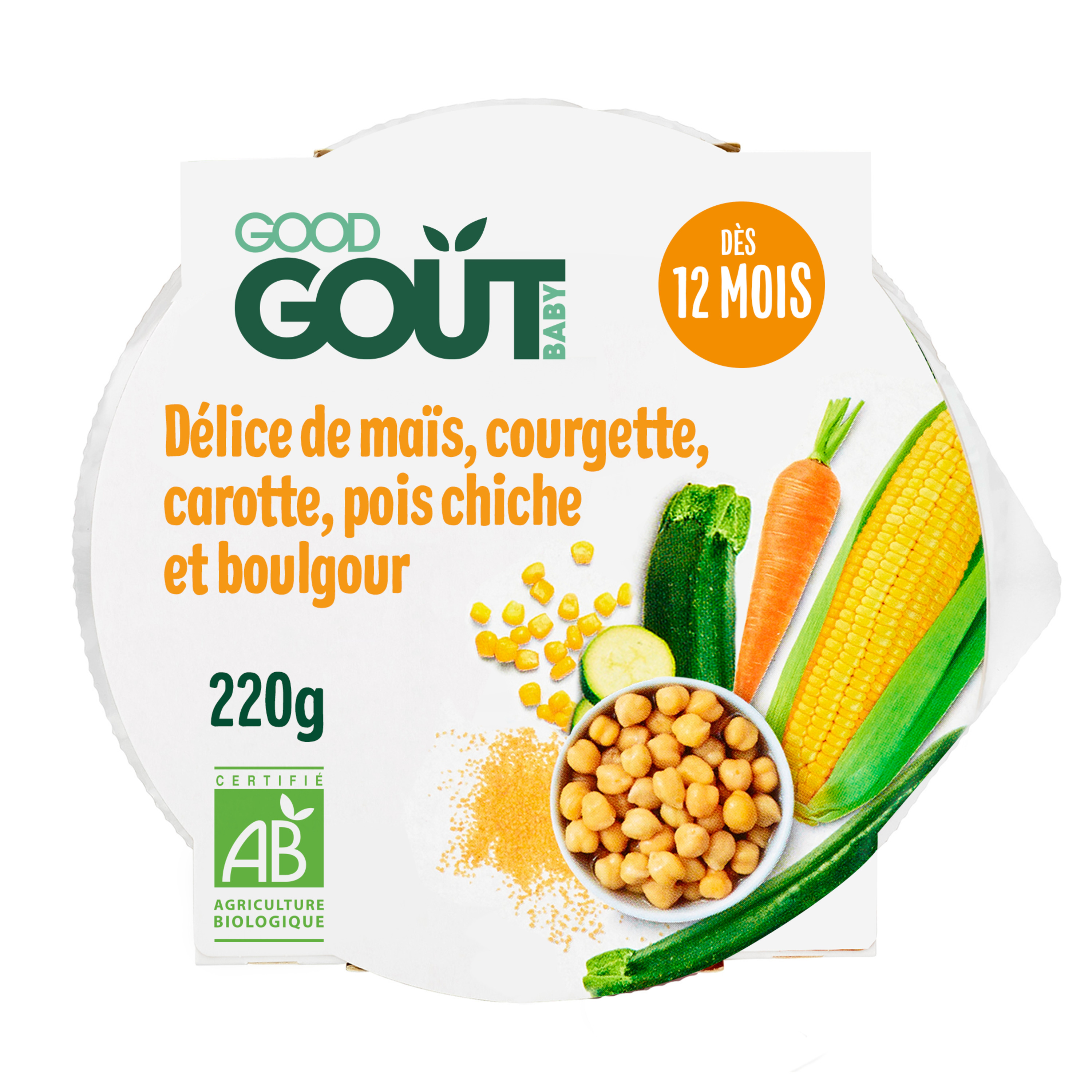 Ingrédients : 41% maïs bio, eau de cuisson, 15% courgette bio, 14% carotte bio, 7,5% pois chiche bio, 2,5% boulgour (GLUTEN) bio, 0,2% huile d'olive vierge extra bio, 0,07% cumin bio.