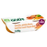 Ingrédients : 44% carotte bio, 23% patate douce bio, eau, 6% oignon bio, 4,5% lentille corail (GLUTEN) bio, 1% huile d'olive vierge extra bio, 0,08% cumin bio.