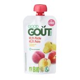 50% pêches bio, 50% poires bio, jus de citron bio concentré, 0% autre chose.