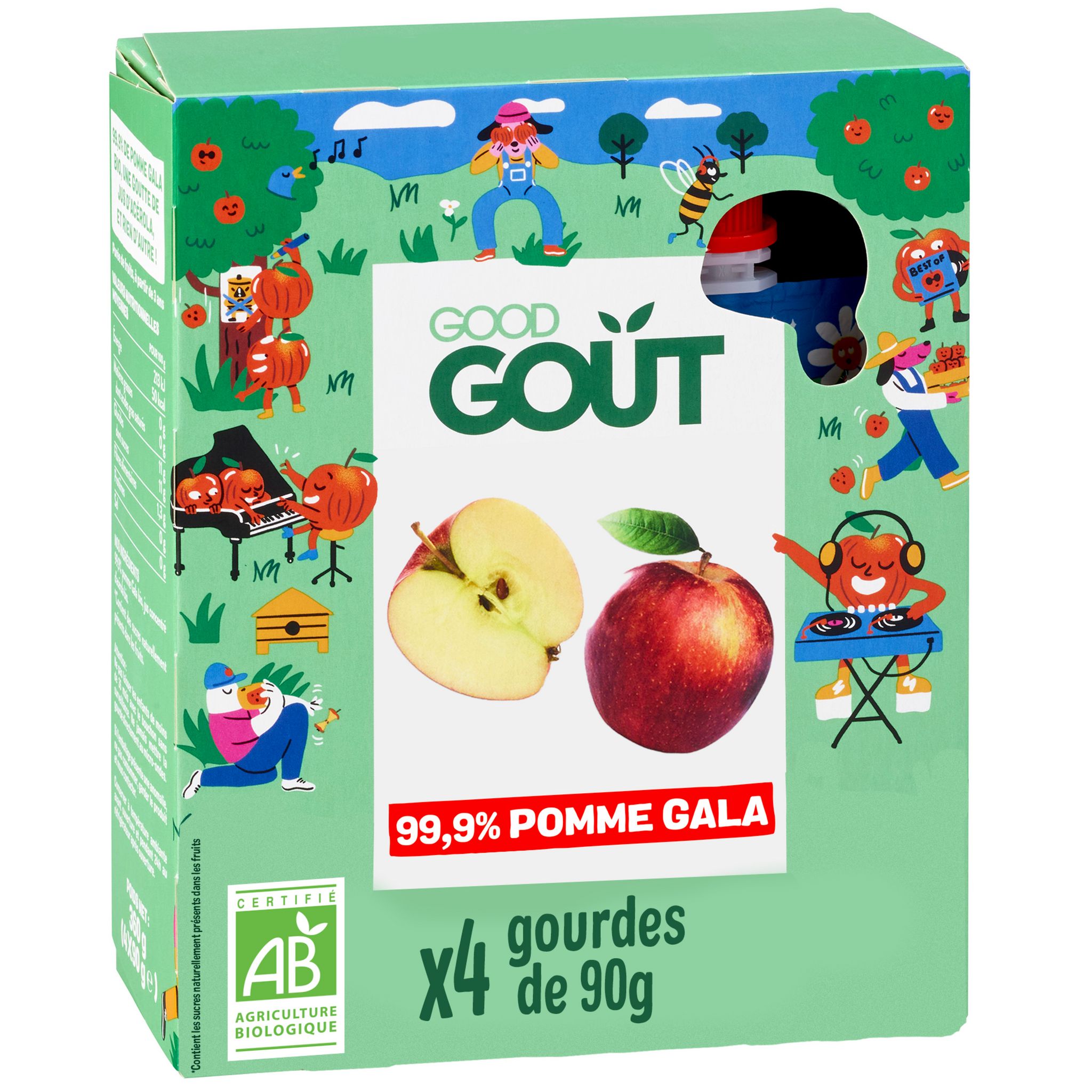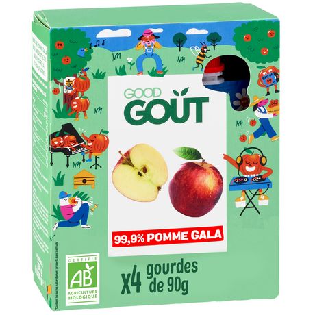 99.9% de pomme gala, une goutte de jus d'acérola, et rien d'autre ! Chez Good Goût, on adore le goût des bons fruits. C'est pour cela que nos gourdes ne mettent qu'un seul fruit à l'honneur ! On ajoute une goutte de jus d'acérola, c'est tout !